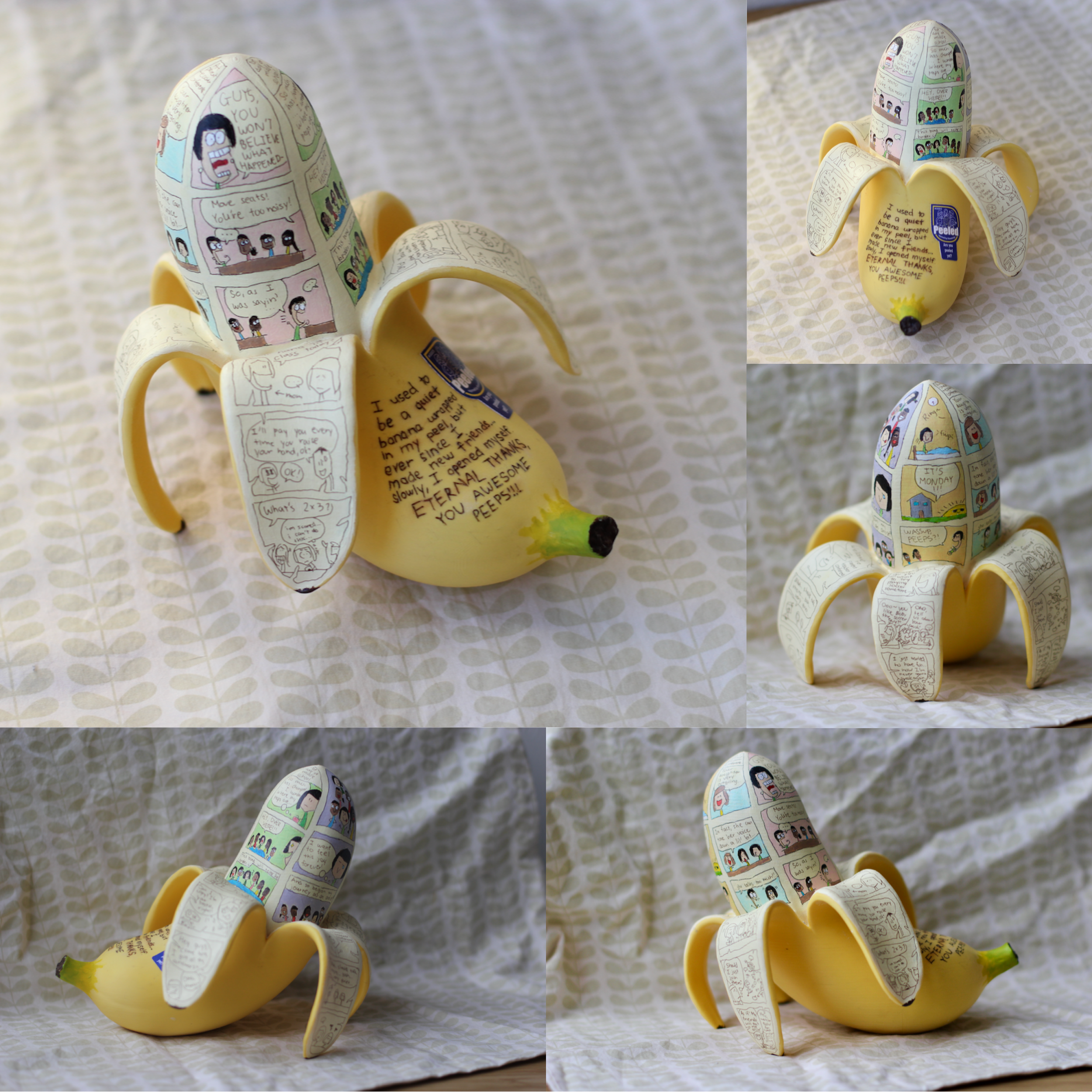 Mediums: 3D printed PLA (banana base), acrylic paint, Micron pens, chalk pastels, pencil. Tools/Process Materials: Blender (3D modeling software), BambuLabX1Carbon(X1C) 3D printer, heated needle (carvings).