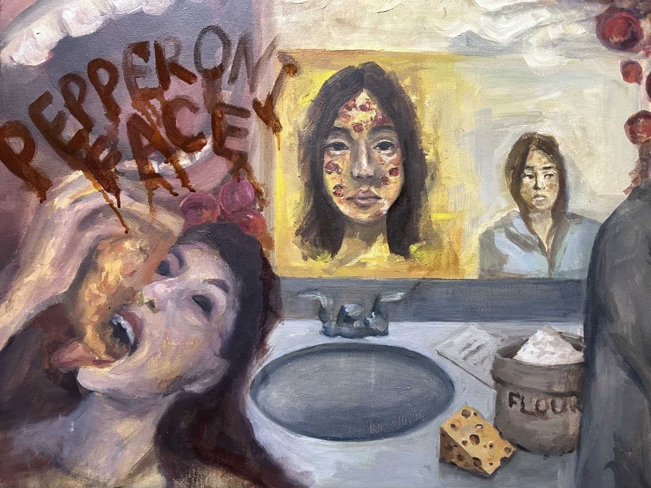 Growing up like any teen, you go through an acne phase. “Harmful jokes” from others, bizarrely even family will form that get to your head sooner or later. One that always rung in my head was pepperoni face—no matter what background you come from you automatically get the reference. Through the creation of the piece I conveyed what I kept seeing day to day, the things I’d often notice especially people eating pizza.