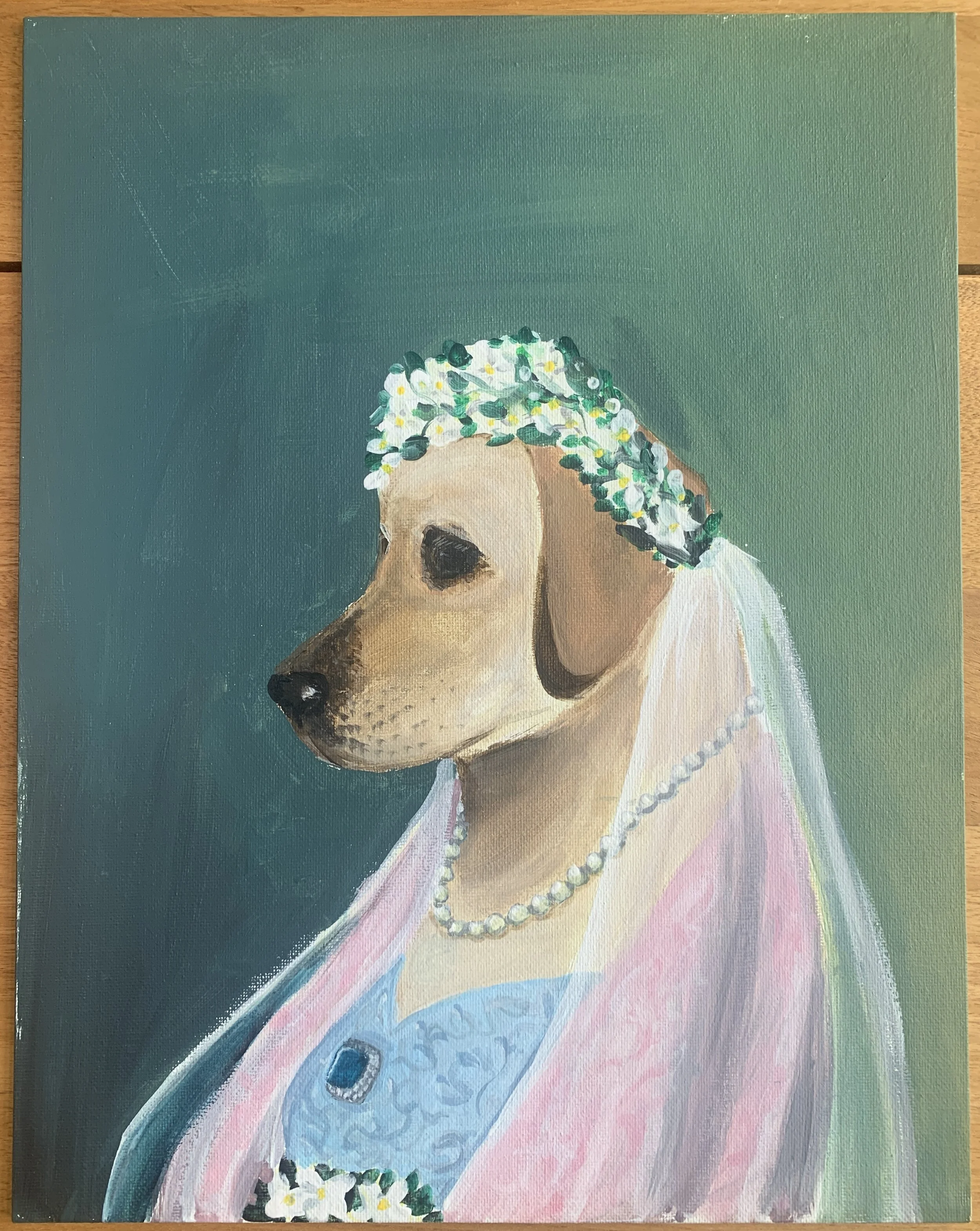 This is a painting of my beloved pet dog, Finley. She has a very regal manner about her and I thought she needed to have a portrait commissioned to celebrate her royalty. For this work, I roughly photoshopped her into a dress, printed it out, sketched it on my canvas, and painted.