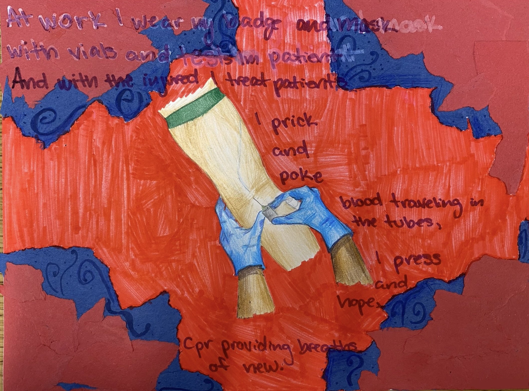 I wrote a poem about my mom's new job, I felt proud and inspired by her because some day I would like to work medically and help people like she now does. My mom has came a long way from where we started, she was my whole world when I was younger taking care of me and my little brother alone at 22 years old. I'm usually not best with my words but I made this art piece to show that I do notice her, and that I am proud to have her as my mom.