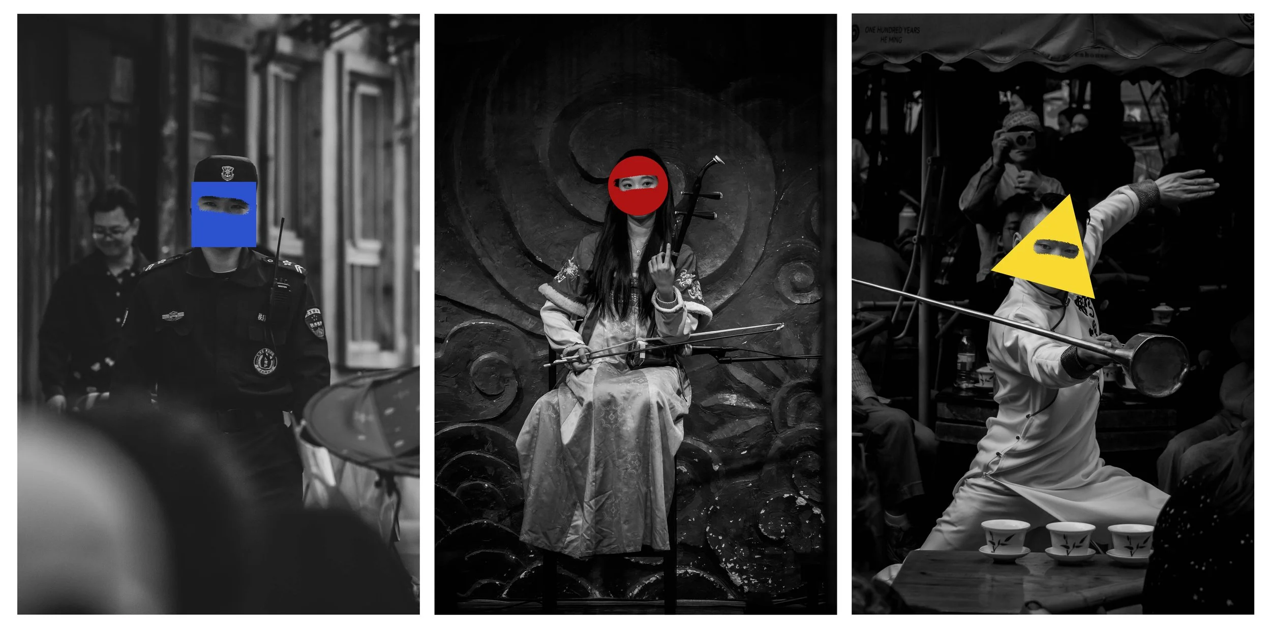 In this series of street portraits from China, I stripped the images of their original color. I then overlaid each face with a single primary color and shape. I'm curious: How does the brain associate shapes and colors? What happens when you apply these to people, and how does this alter our perception of them? These are the questions I wanted to explore. I assigned each color and shape to each person based on what instinctively felt right to me. Do you agree?