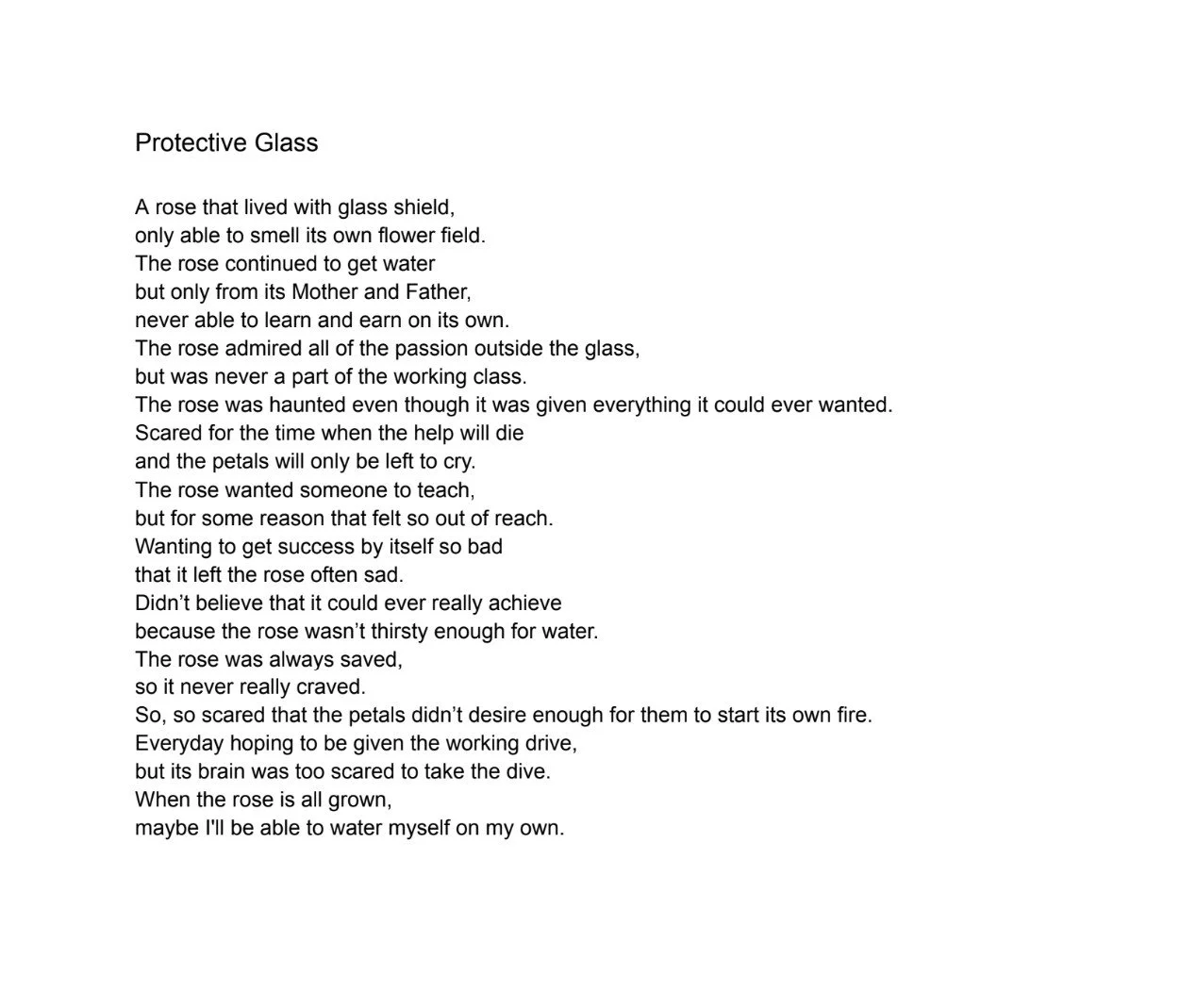 I wrote this poem because I was worried that when I got older and lived on my own I would not be able to navigate life or figure things out by myself given that my Mom and my Dad do many things for me. Even though I work really hard in school and strive to be the best, my parents have handed me almost everything in my life which I am very grateful for, but it still instills fear in me.