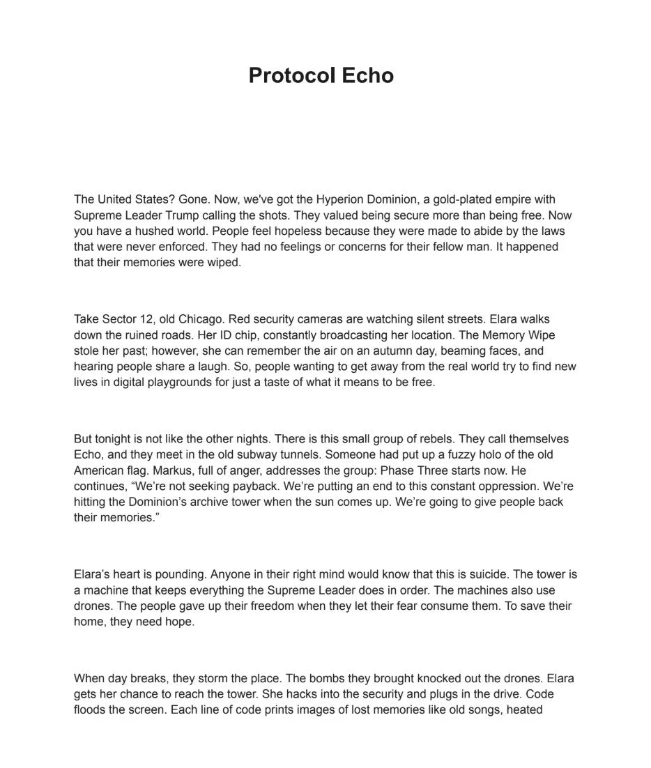 The story depicts a dystopian future where the Hyperion Dominion, led by Supreme Leader Trump, rules the former US, having wiped citizens' memories to enforce silent compliance. Elara, a woman with fragmented recollections, joins the rebel group Echo. Their mission is to restore lost memories by hacking the Dominion's archive tower. After a high-stakes assault, Elara uploads the true history. Markus sacrifices himself. The people regain their past, shattering the Dominion's control and replacing the oppressive silence with the sound of collective human voice and life.