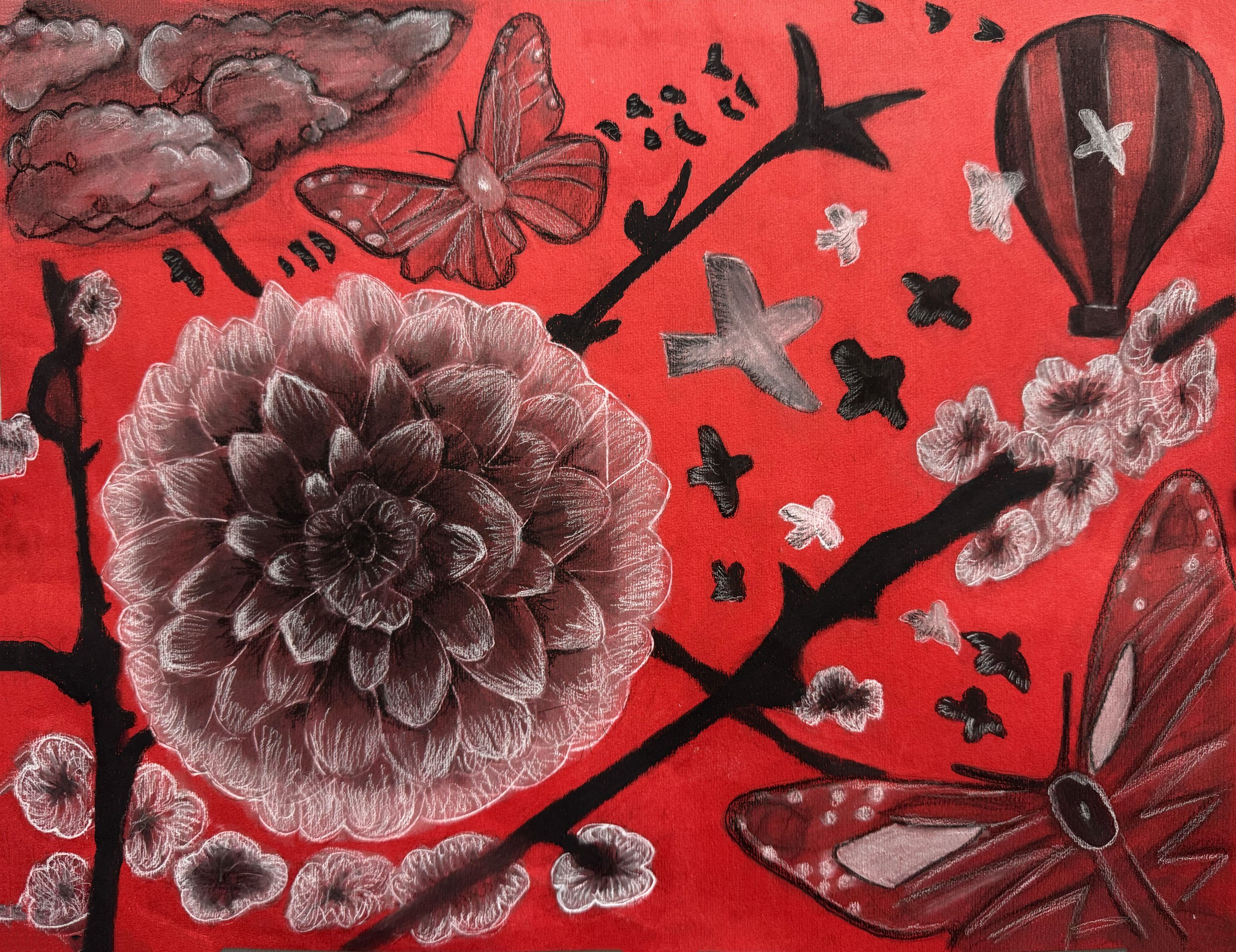 I used an app called Procreate to assemble different objects and things that represent rebirth and happiness in nature. I also picked a red background to make the structure of everything pop more.