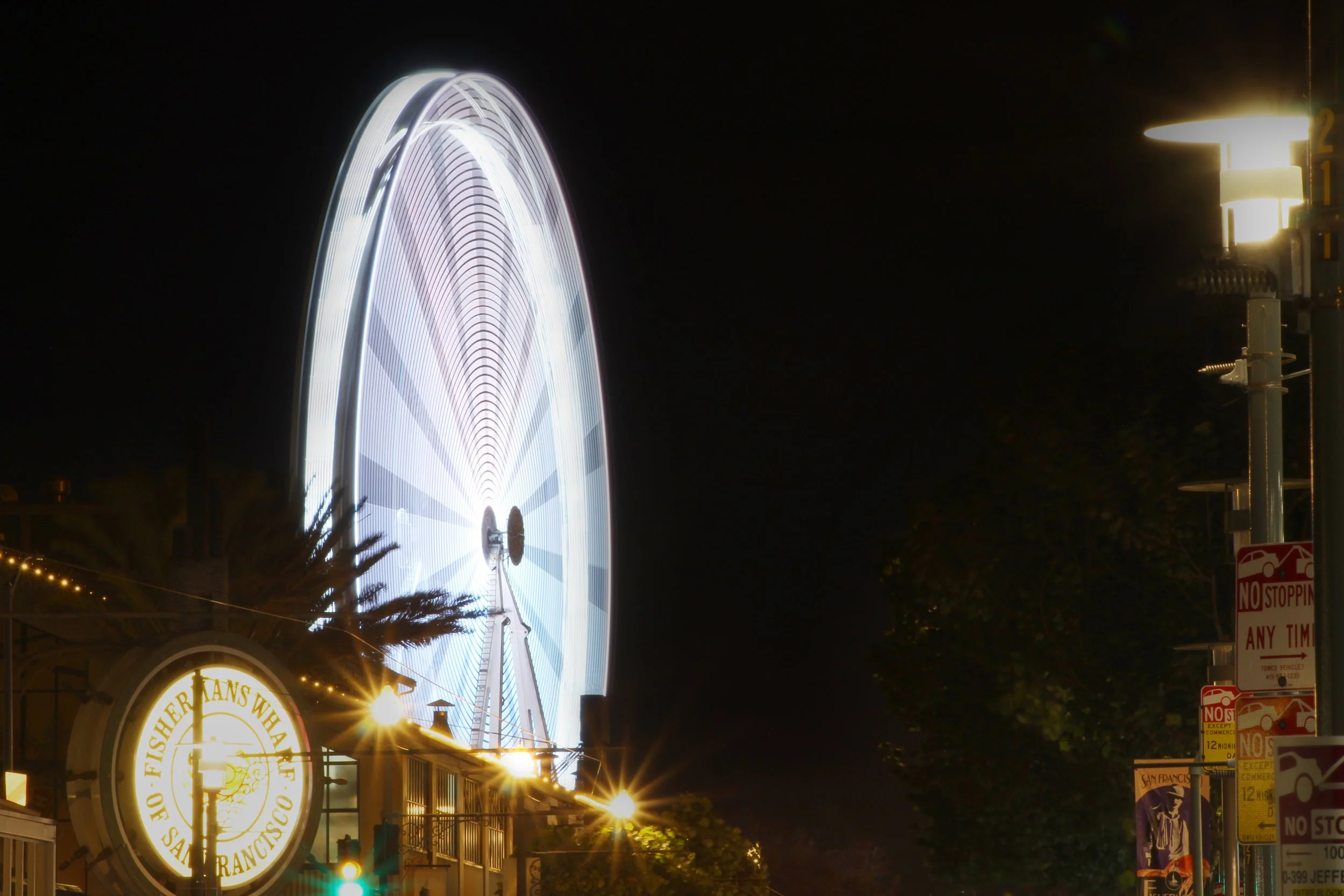 My photo captures a slow shutter of the ferris wheel at Pier 39. It captures multiple moments of the ferris wheel spinning.