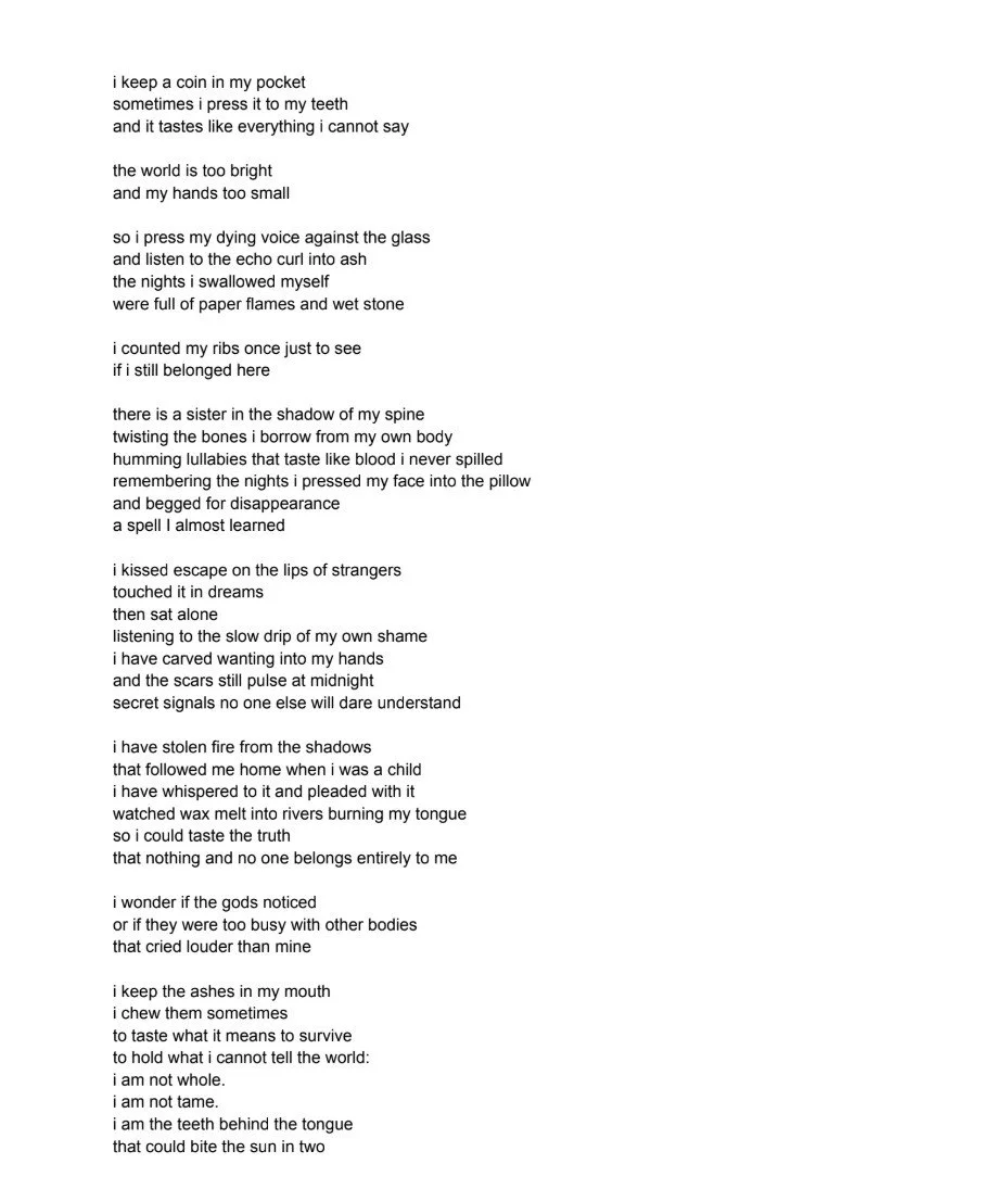 Ribfire is the sound of a body trying to survive itself. I wrote it to give shape to the things I could not say aloud. The fire I carried in my throat, the sister living in my ribs, the ashes I keep in my mouth. Writing was violent and tender at the same time: I pressed my voice against the page like teeth to glass, let it break, let it burn. The poem is a ledger of wanting, of hiding, of confessing to nothing but ink and ash. Every image, from paper flames to stolen fire, comes from the parts of me I learned to swallow, to erase, to forget. This work is about being not whole, not tame, not safe. But alive. It’s about letting someone see the trembling hands, the pulse beneath the scars, the teeth behind the tongue, and understanding that survival sometimes tastes like fire.