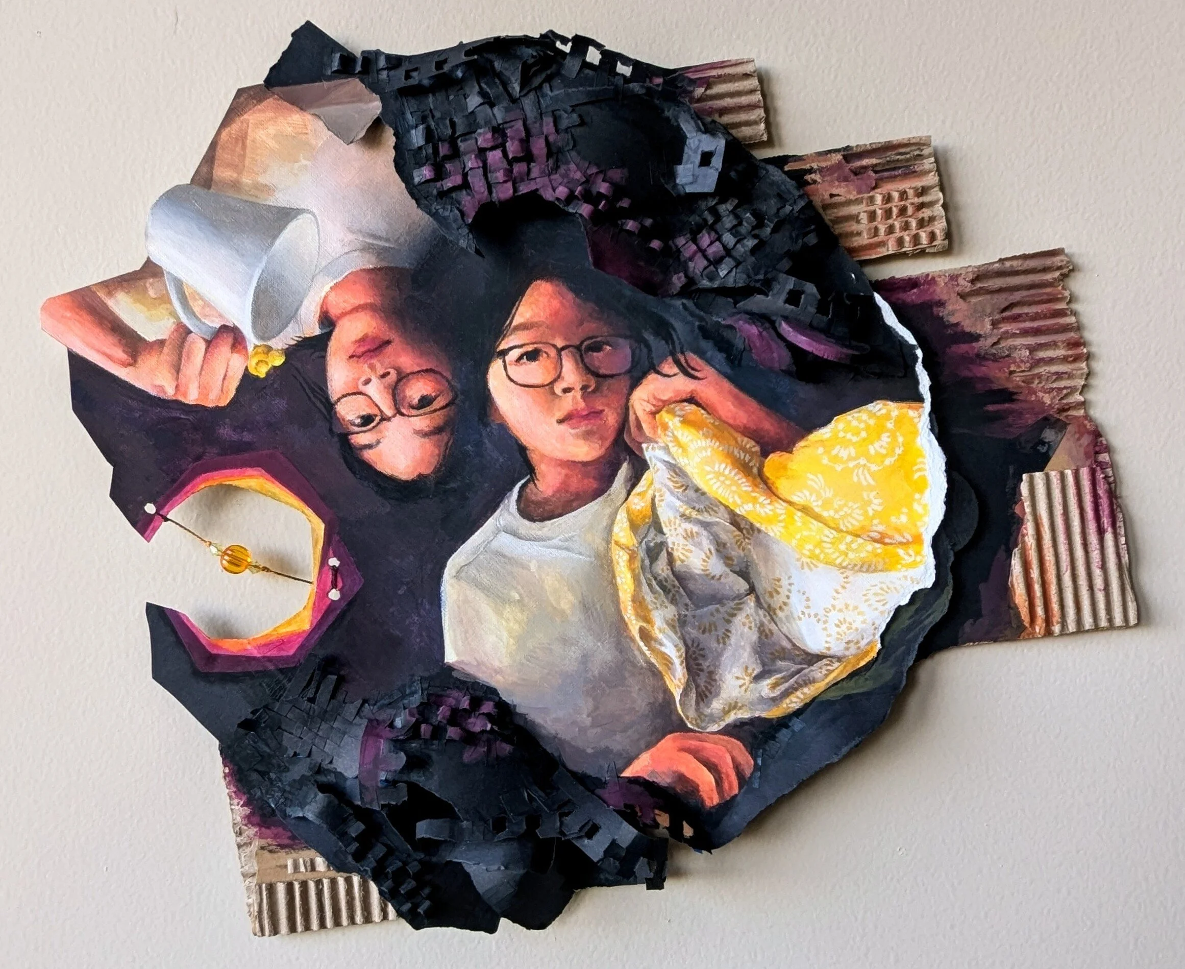 In this piece, dual self-portraits are shown in an opposing yin-yang configuration. The rippling background around the subjects surge into the 3rd dimension, much like dark ocean waves. Around the piece, exposed raw cardboard reminds the viewer of the physical, structural reality beneath a layer of abstraction.