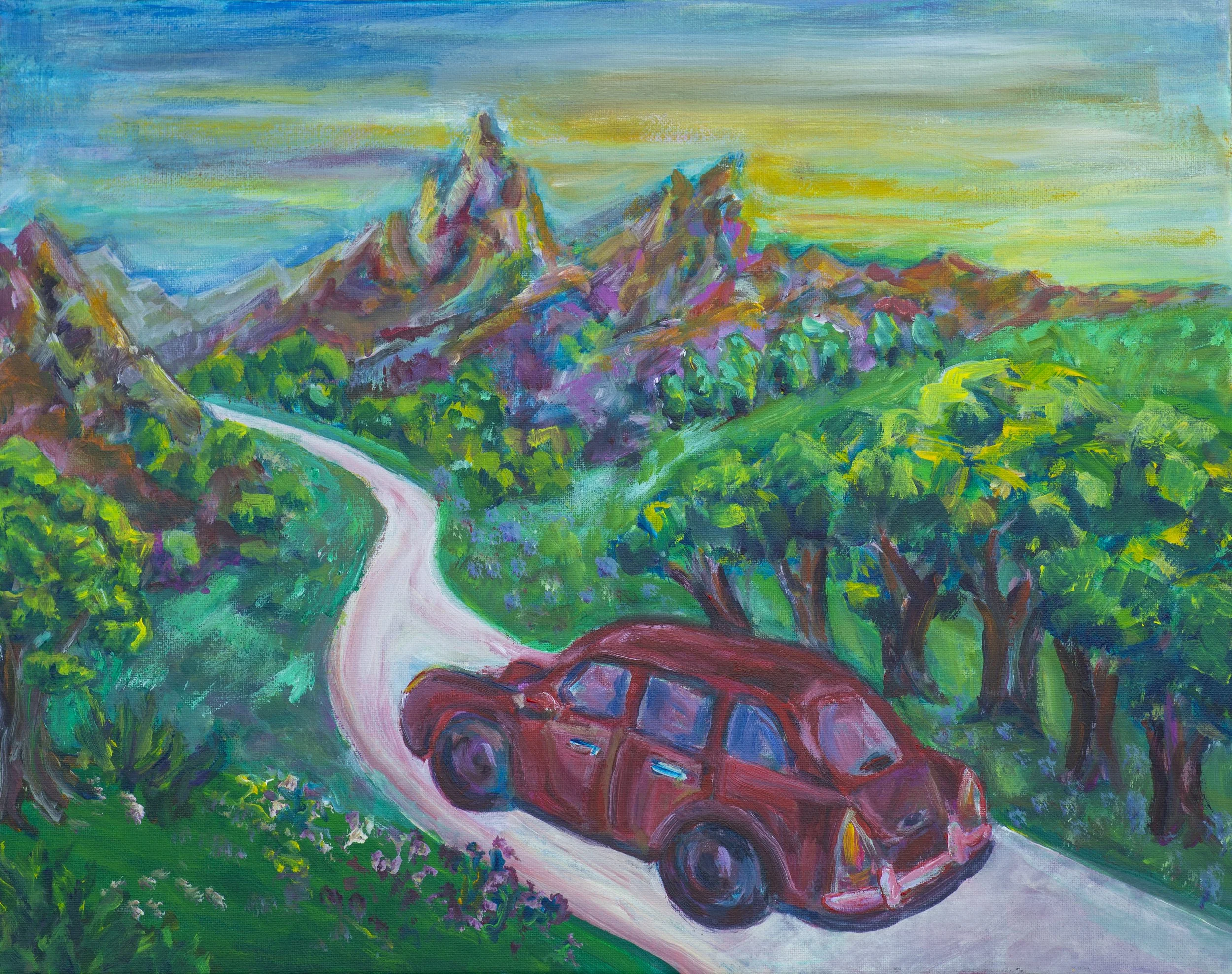A car is on a high-speed journey when suddenly magnificent mountains come into view. The vibrant pinks and oranges of the rocks create a dreamlike quality, and loose brushstrokes around the road convey the excitement of the experience. The sun begins to set, and the viewer appreciates the last few moments of daylight as they notice the sun’s golden rays shining on the leaves of the trees, and blending radiantly with the blue sky. While painting this scene, I was inspired by my childhood road trips with family.