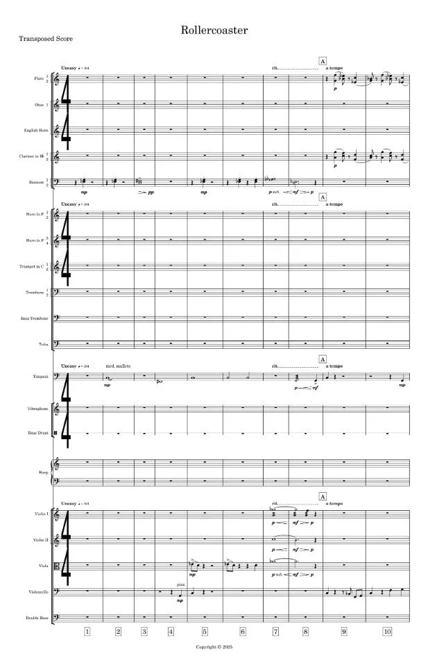 Rollercoaster was inspired by a recent trip to Anaheim’s theme parks in southern California. A feeling of cautious wonder and unease is introduced by the bassoon and timpani, as a towering gravity-defying roller coaster slowly comes into focus. The melodic theme provides a hint of what’s to come. High string pedal tones arise, conveying a sense of fear, highlighted with nervous energy, as the adventure slowly begins. Harp and vibraphone notes magically transform feelings of unease into anticipation, as more instruments are added and layered, with the tempo quickly accelerating, mirroring an ever faster-beating heart. A trombone slide propels the music over the peak of the ascent, leading to the whirlwind portion of the ride. But all too soon, a final variation of the original melody emerges, concluding the brief journey, with elation fading to a wistful sadness - until next time.
