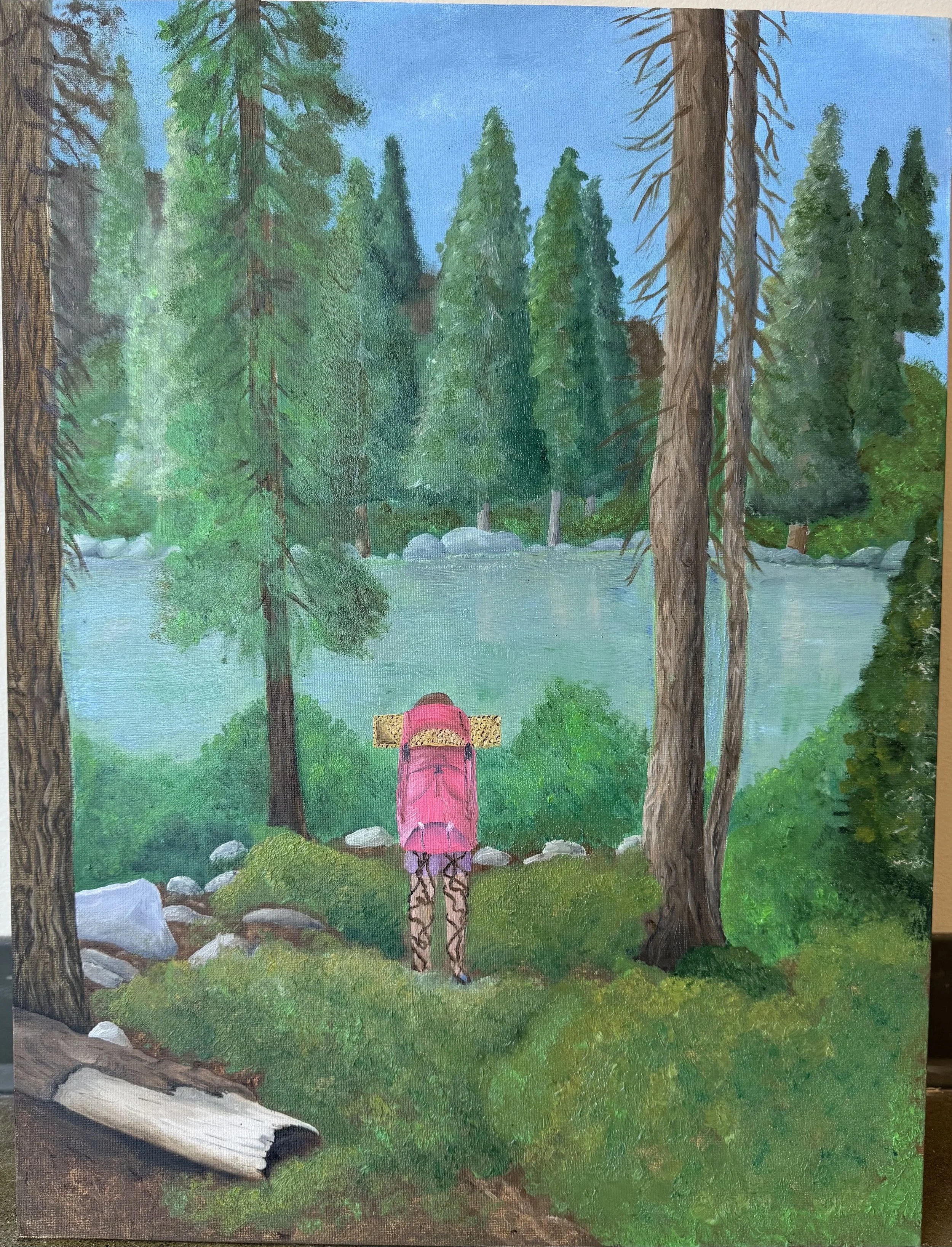 I have a very deep personal connection with nature and it really impacts my emotions due to growing surrounded by it. My piece displays a landscape of greens and blues, displaying all the life and growth that happens out in nature, as well as personally in myself. To make myself pop out of the picture more, I displayed my figure by contrasting all the green in the painting with a red backpack and a yellow mattress pad. In the painting, I have roots that are wrapped around my legs. These roots represent security and safety, and how being out in nature calms everything going on in my life, as well as in my head. This connects to how I feel in nature as well as how I use nature to help with stress and anxiety.