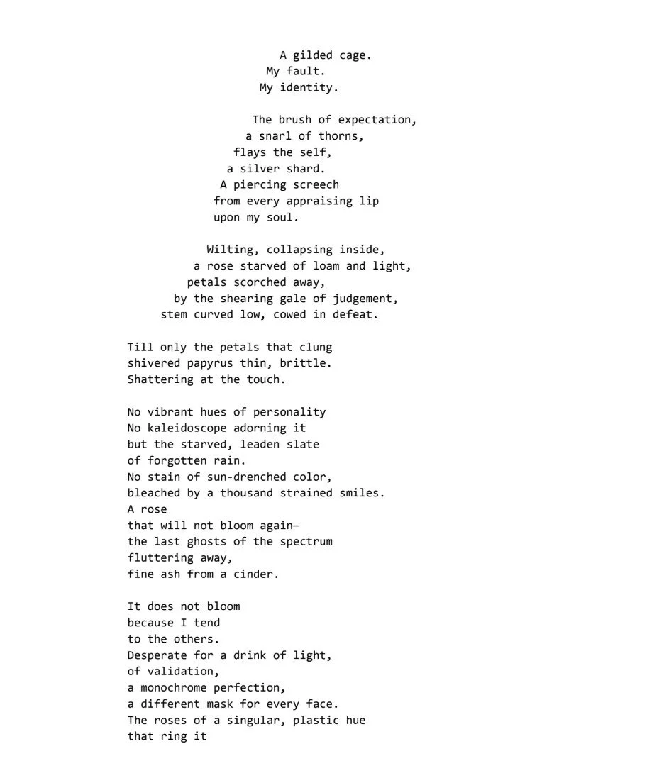 My work, "Roses" challenges the burden of conformity and loss of authenticity and urges readers to reclaim and accept their beautiful identities. My work, revolving around themes deeply personal to me, explores the corrosive nature in a life defined by the choices of others and a loss of autonomy, both an appeal and a confession. The consistent metaphor of a rose is sustained throughout the free-verse and concrete (rose-shaped: a bloom paired with the descriptions of the flower, a noose at the thinning stem/stalk, roots fanning out and showing depth) poem. This is the psychological landscape of a life lived as a puppet. It ends on a poignant note regarding the unending cycle of burial and rebirth. It compels the reader not to follow the same path of self-denial and doubt and embrace their "multi-colored petals and hues". But overall? This is who I am. This is my rose.