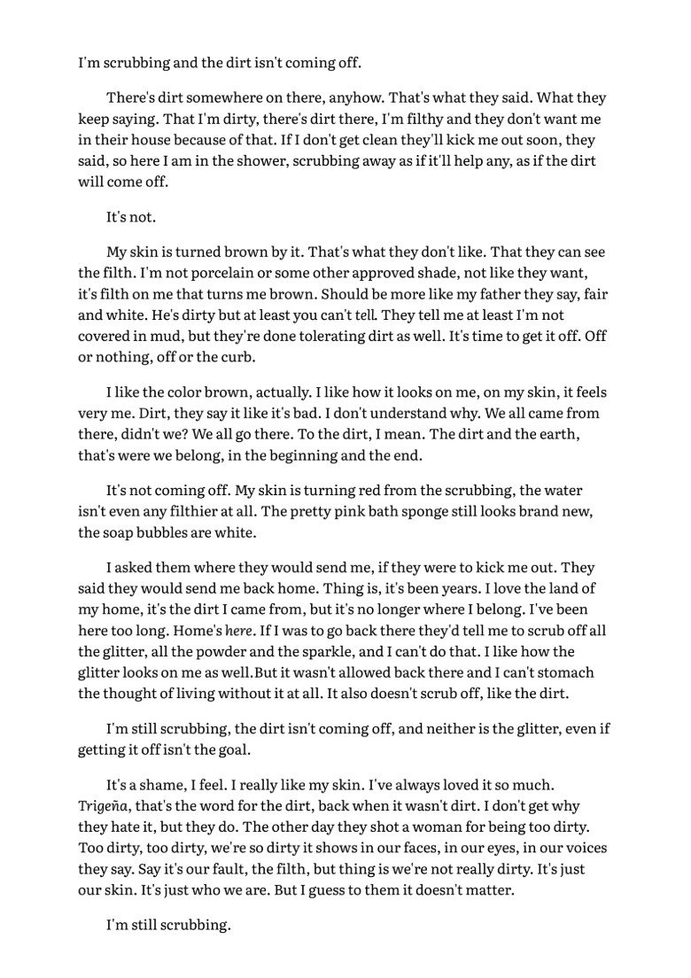 This is story draws heavily from my own experiences and my own feelings. Sometimes, I feel like people ignore what it's like right now, for people like me. Technically I'm fine. I feel disconnected from it all. But it still lingers in my mind, it weighs down on me, eats the peace I previous had. I can't change myself, even if I wanted to. I can't scrub off the dirt. I wanted to capture the helplessness of the feeling. The lack of commitment to change that can't happen, but that other's want to happen. The pointless demands, the threats, and the way they would uproot my whole life if carried out. I had to get it out there.