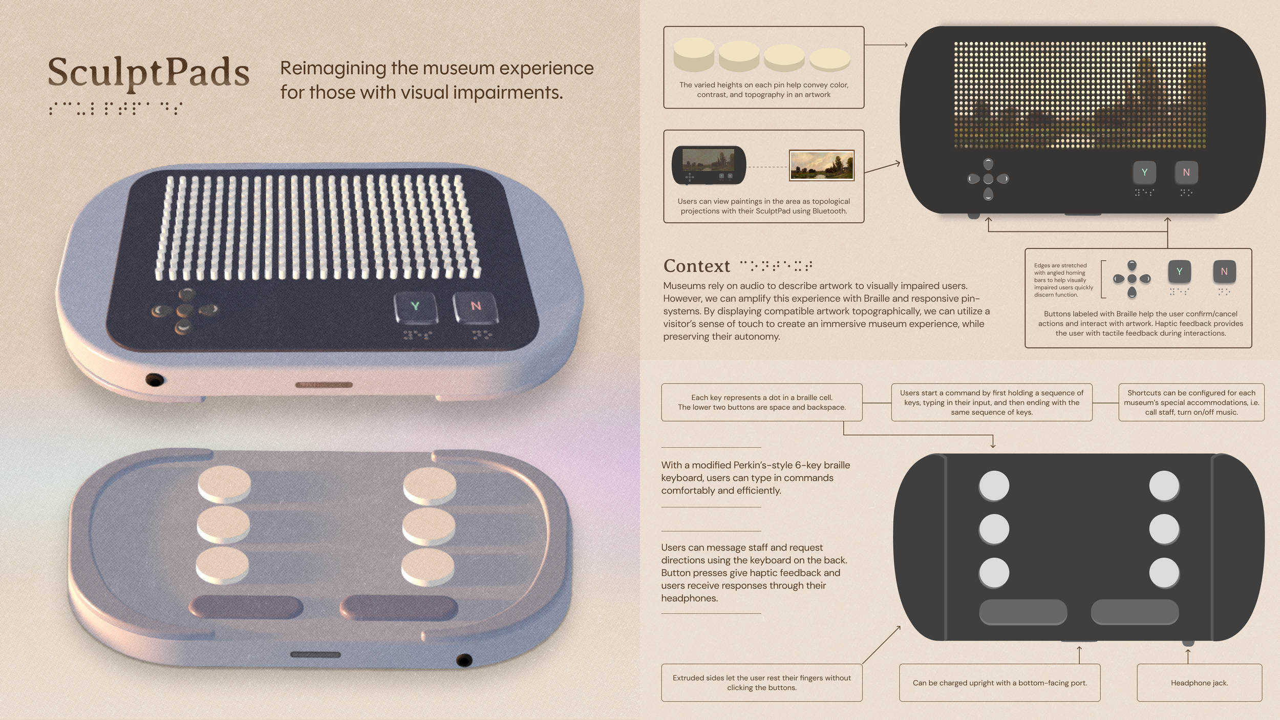 Inspired by the lack of support for people with visual impairments at my local fine arts museum and research on the technological synergy (Bluetooth interactions) of teamLab exhibits, I started designing SculptPads a year and a half ago. During this time, I’ve worked closely with diverse community members throughout my county and iterated through twelve different concepts. Through these interviews and observations, I’ve learned so much about the challenges PWDs face in public settings (namely loss of agency and technological ostracism), and reflected these in the final design for SculptPads. My creative practice is rooted in human connection, “conversations” that I have with my community daily. Only through empathy can I respond with meaningful solutions. Through this piece, I hope that viewers are inspired to examine the issues impacting their own communities and start seeing art not only as a medium for self-expression, but a catalyst for advocacy and problem-solving.