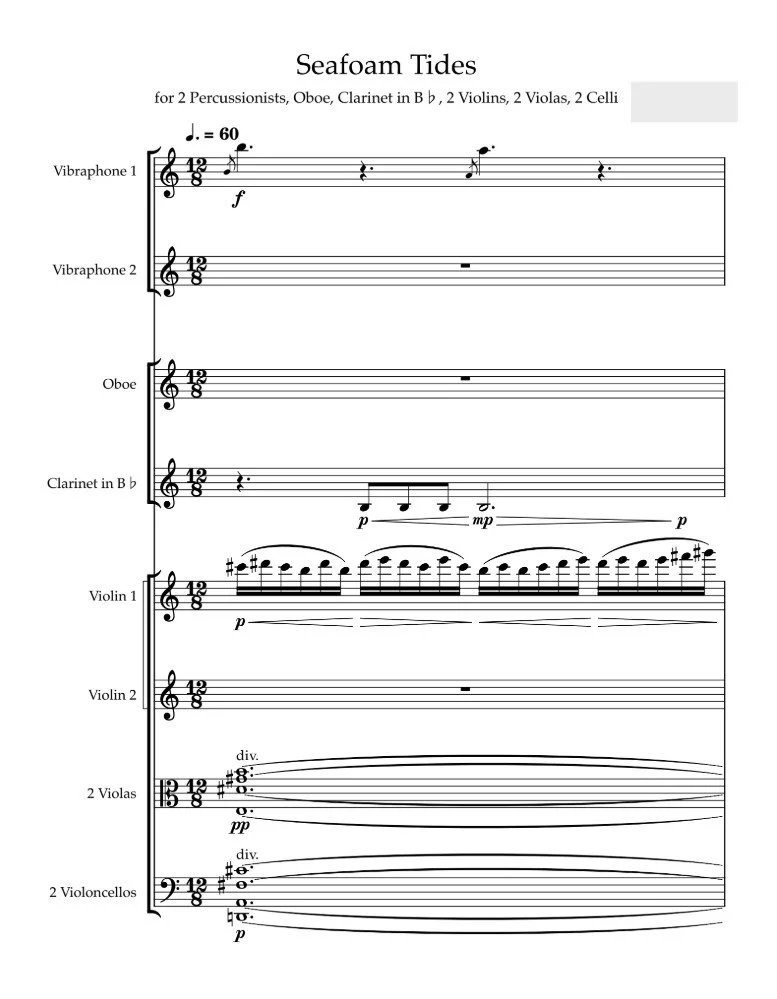 “Seafoam Tides” gets its name from the layered textures in the instrumentation, mimicking foam that floats on the surface of ocean waves before washing onto shore. “Tides” in particular refers to the larger sections of the piece, within which lie numerous smaller contours of rising and falling pitches. Some sections may sound soothing while others may feel unnerving, but still the piece ebbs and flows with no clear destination or resolution, traveling through different musical phrases simply for the sake of the journey.