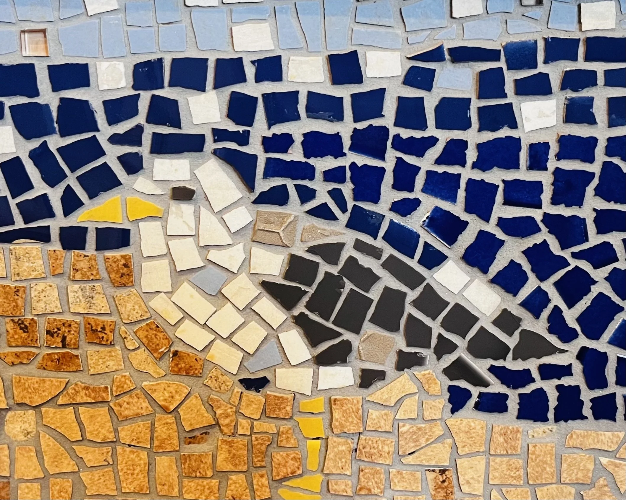 This is a mosaic of a photograph that I took in Italy. It is of a seagull standing on a ledge at a port.