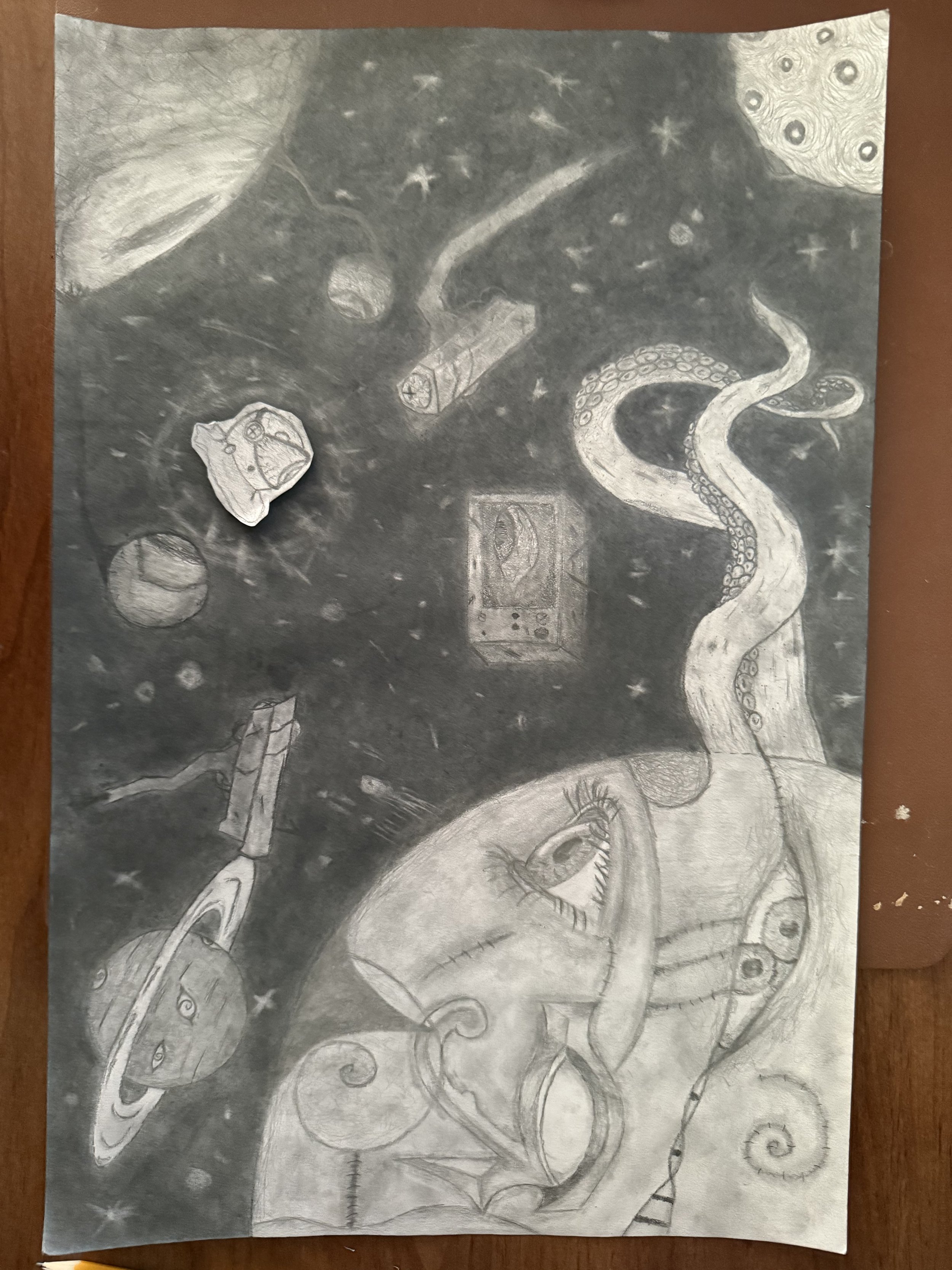 This artwork can mean whatever you want it to mean. But to me, it’s about the feeling of being watched by society and sticking out and about nothing ever really making any sense. To me it’s about floating in space going through life trying to fit in, unsure if you really do or don’t. Unsure if someone is looking at you or behind you. Being unsure about what people have gone through and what they think of you and others. Maybe none of that makes sense to you, in a way it doesn’t to me, and that’s alright with me. This artwork can mean whatever you want it to mean.