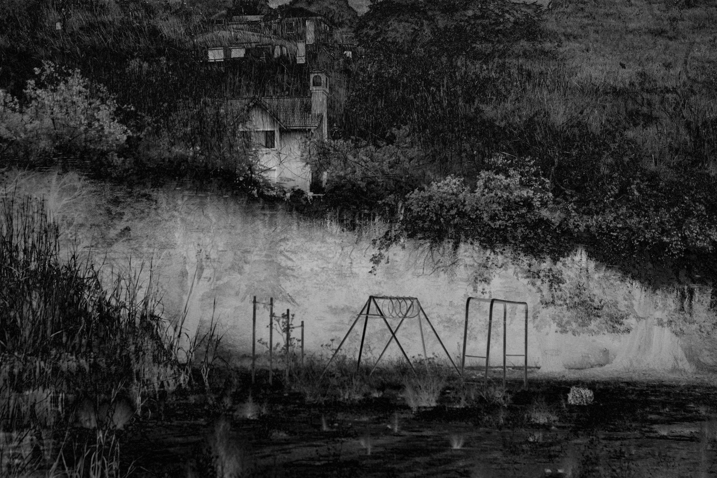 This black and white double exposure shows an abandoned park with a fading river cutting through it, with white space acting like a bright scar. The swings and overgrown path appear and act as a creepy background with lots of interesting details. In the background, the mountains have gray tones, adding depth. The contrast in colors between the dark, forgotten park and the glowing river created a feeling of time slipping through the landscape. Both revealing what remains and what has already disappeared.