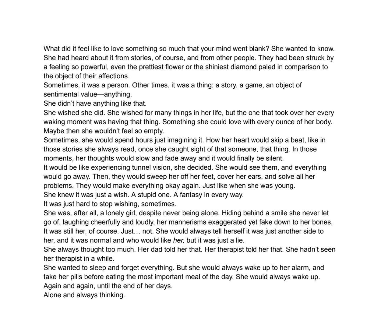 She Creative Writing Feb 5 Written By Tools BACF Kaia A. Artist Statement This is a work that resonates with me, and I hope will connect with others. This is a short story about love and yearning. Creative Statement For me, really, creativity just means putting down all the thoughts in my head on paper before they die there. Tools BACF