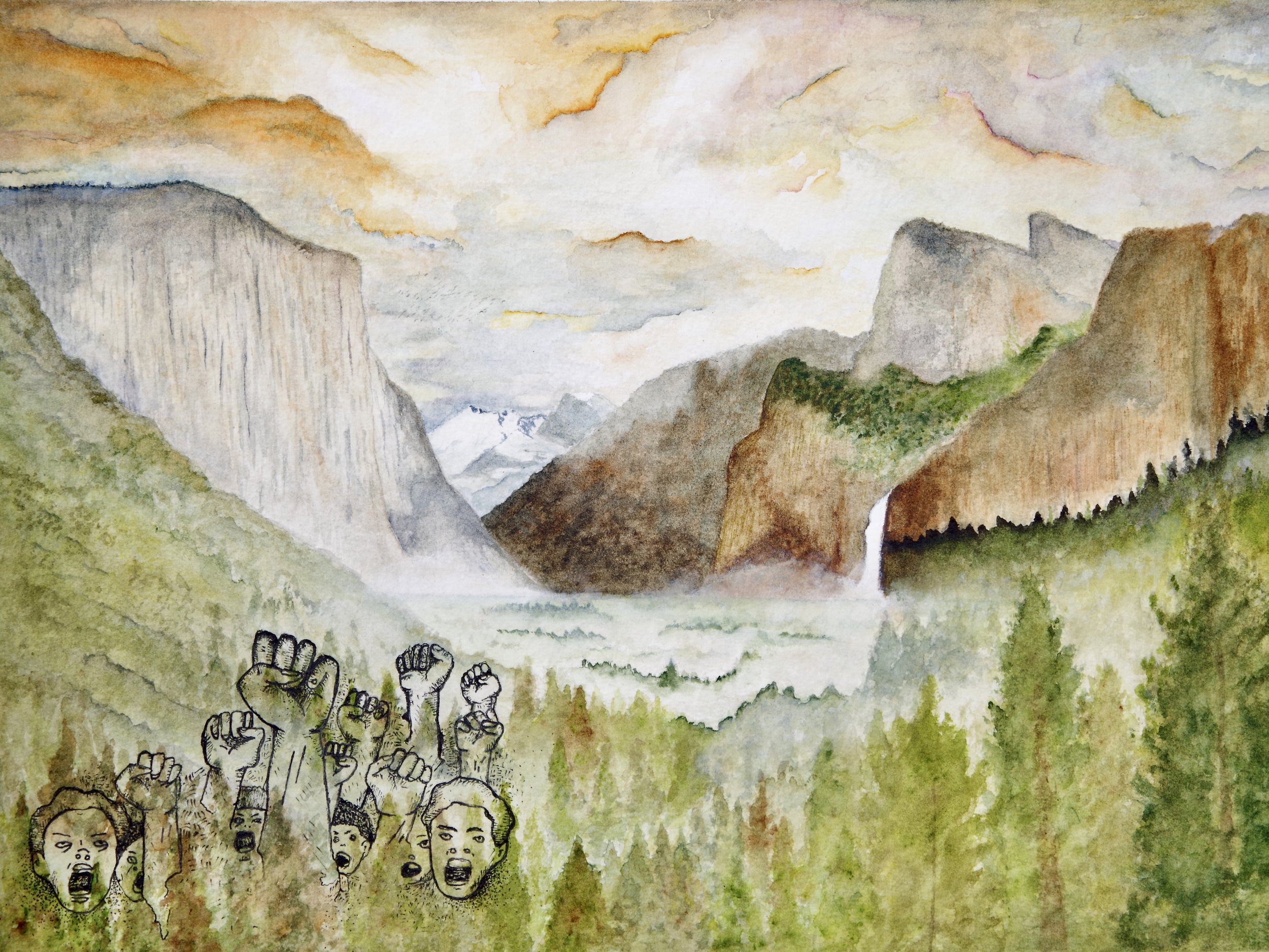 The landform of my painting is the Sierra Nevada Mountains, and I chose it because I thought it was a powerful image to represent the strength and resilience of the Black Movements. These mountains are found in Yosemite Valley National park. My painting illustrates the metaphor subduction, which is a process that forms and shapes the land. It shows how justice is achieved by the black leaders of the Civil Rights and Black Power Movements. The Sierra Nevada Mountains are also known as the Sierra Nevada Batholith. A batholith is an immense mass of rock that has formed from magma below the Earth’s surface that has cooled for millions of years. The justice achieved by Black movements is the Sierra Nevada Batholith, accomplishments rising up from a subducted plate, uplifting our people after we were pulled down by racism.