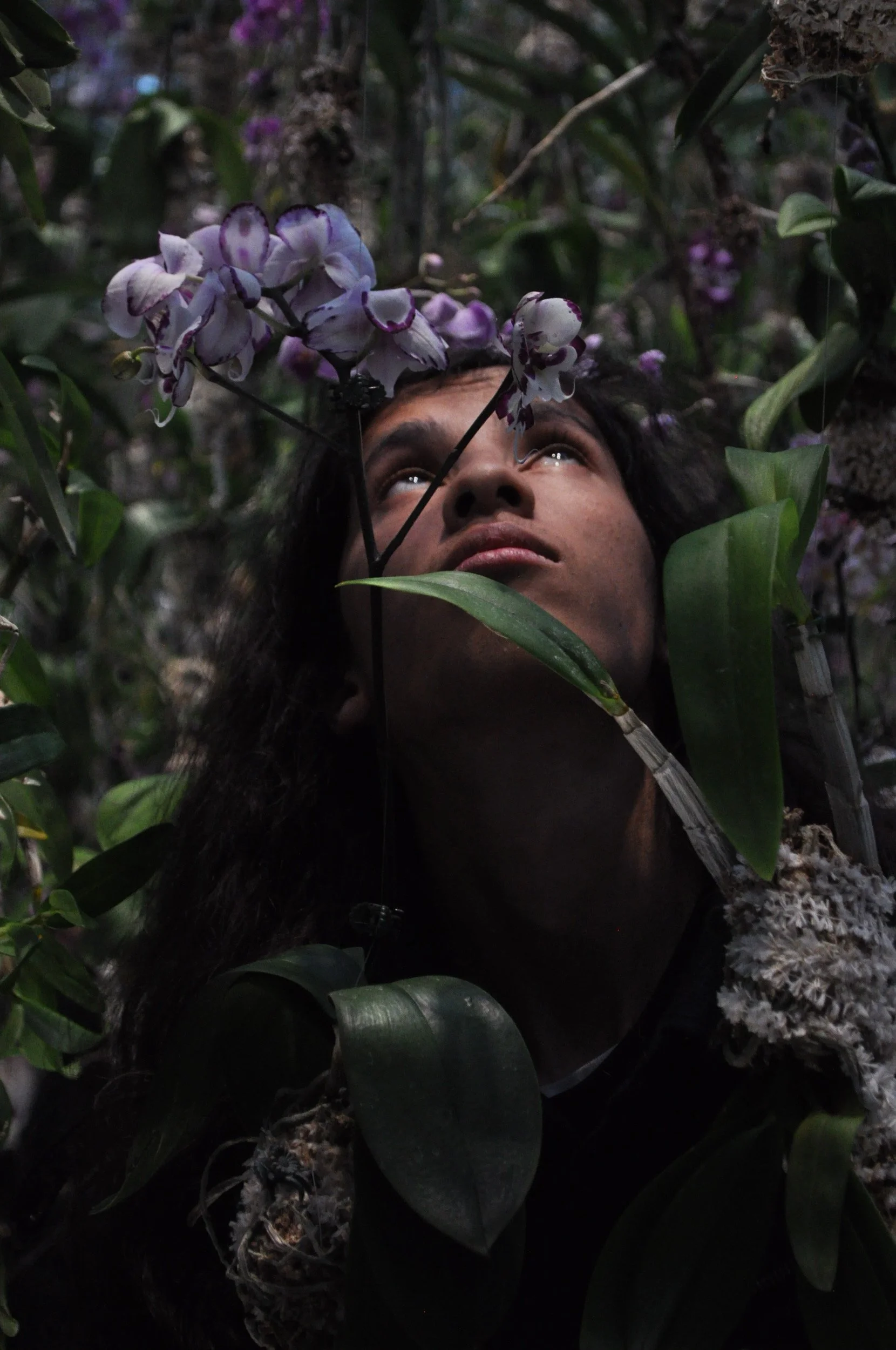 This photo was taken in Tokyo, at Planet Team Labs, specifically in a mirror-lined room filled with live orchids suspended by wires. The room felt alive, with motion-triggered flowers rising and falling according to my movements, and the smell of the flowers was thick in the air. As I walked, it felt as if I were carving my own path through the space. I had my brother explore a new area of flowers and hide amongst them, shrouded. Then, I saw my brother look up, the light falling across his face, and I took this photo. Although the viewer cannot see what he is looking at, it’s clear it is beautiful. I used this photo to demonstrate that in the room and in life, every person has a unique experience.