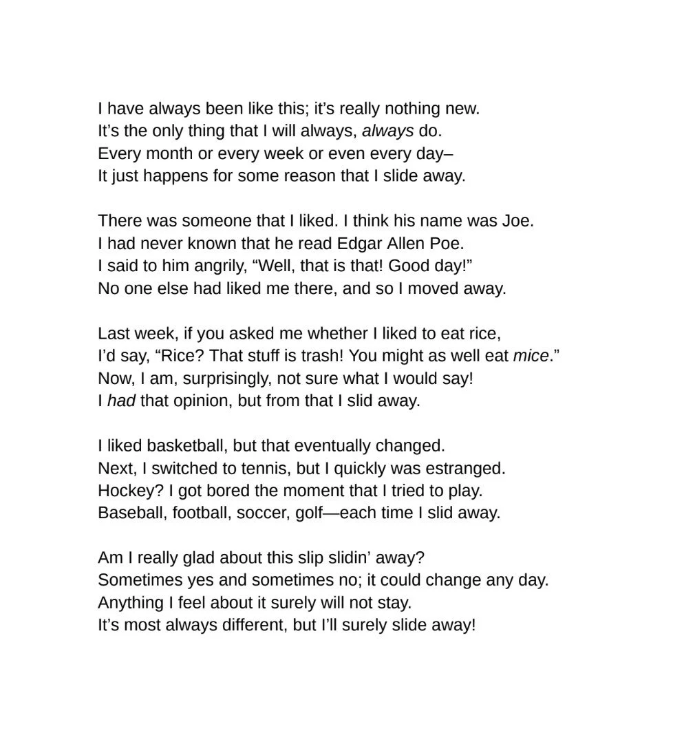 I wanted to write a piece named after a song, so I decided to write this piece. If you just glance at the piece, it doesn’t make much sense. The stanzas are scattered with some meticulous detail in some very specific places, then go off on a long tangent somewhere else. Scattered, right? But the magic really appears when you look at the whole theme of the poem. It’s about somebody who’s not quite interested in anything in particular, but fluctuates between everything. So the narrator’s scattered, his interests are scattered, and the whole poem’s storyline is scattered! This poem is only subtly deep if you think about it. But it’s a fun, little poem too!