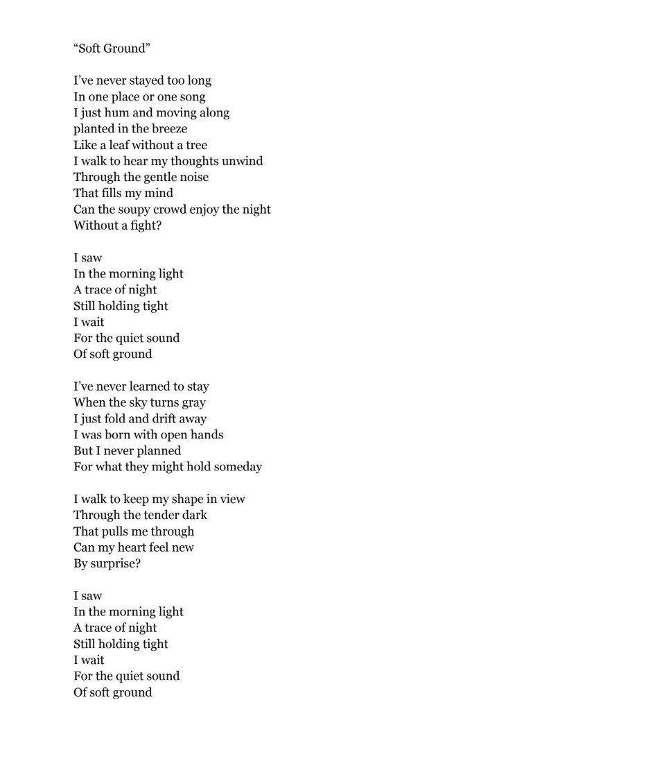 “Soft Ground” is a creative writing piece that uses a drifting narrator to explore the feeling of moving through life without fully settling. Although the imagery of leaves, open hands, and shifting light may suggest personal experience, the song is not autobiographical. Its themes come from my interest in how people imagine change, uncertainty, and the search for a gentler place to land. The narrator walks, listens, and observes as a way to stay connected to themselves, even when the world feels unsteady. I wanted to capture the quiet emotions that can appear in moments of transition and the small hope found in noticing something new at the edge of night and morning. “Soft Ground” reflects my curiosity about how we create meaning in motion, not any direct experience from my own life.