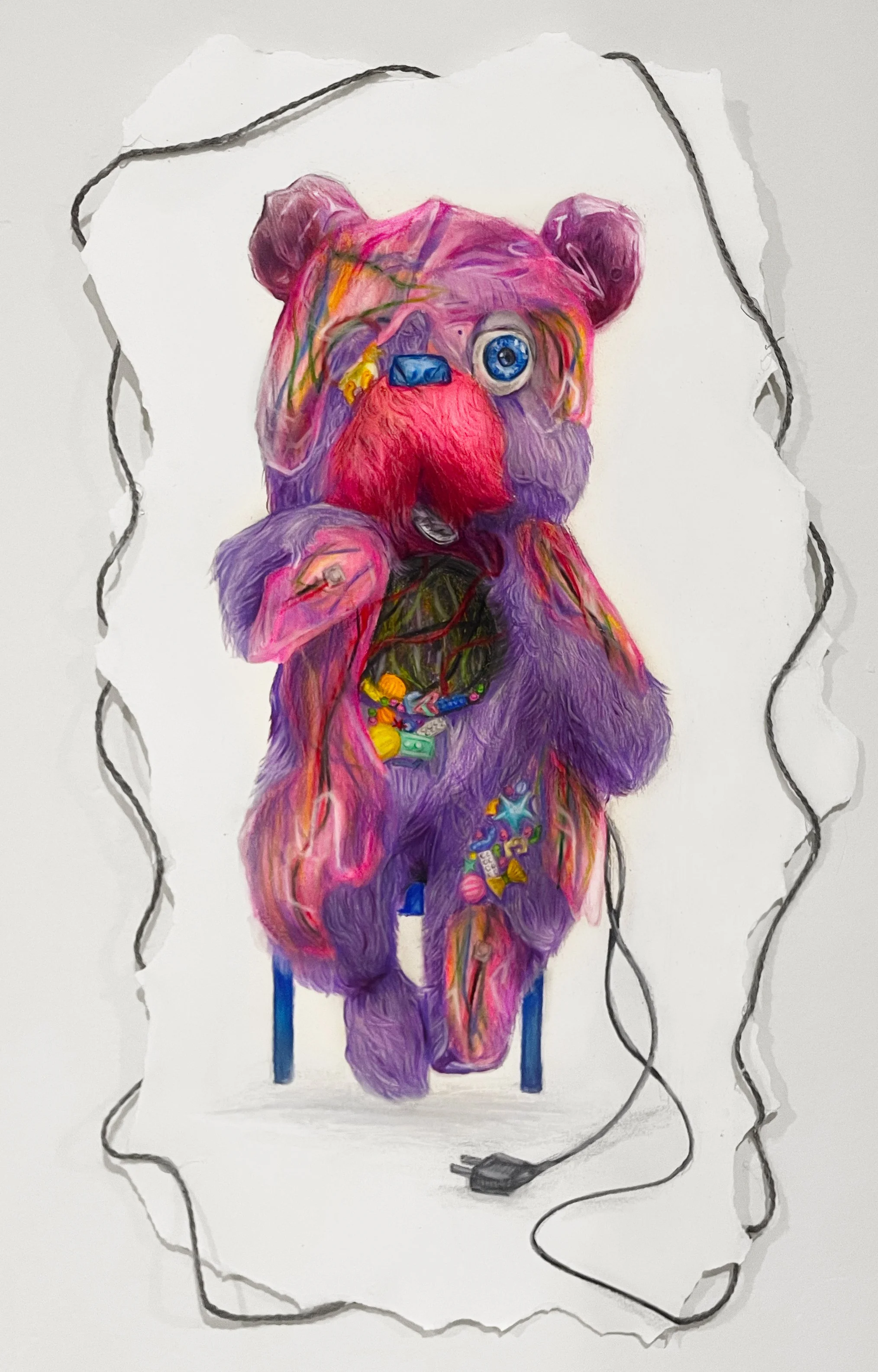 This piece reimagines a childhood bear as a symbol of overconsumption in a tech-driven world. By opening the bear and revealing small toys inside, I wanted to show how objects are stuffed with playful distractions that create a quiet sense of overload. The artificial neon palette echoes the glow of screens and sets up a clear juxtaposition between softness and manufactured intensity. The unplugged cord suggests both dependence and depletion, hinting at a creature shaped by the systems that animate it yet left powerless without them. While making this work, I layered gentle textures with saturated colors to heighten the tension between natural and synthetic forms. I hope viewers feel the bear’s initial charm before sensing the uneasiness beneath it. The piece reflects on how consumer culture fills and shapes us through objects meant to comfort and entertain.