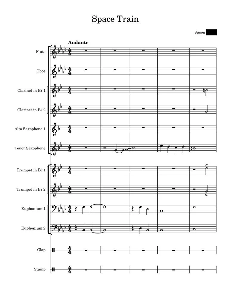 All aboard the train! Next stop: outer space. Space train began with a request for a train themed piece. Of course, anything train-related needs percussion, with a notable lack of percussionists present, we used claps and stomps to emulate the racketing tracks of our train in a journey into the stars and back down to Earth. The piece starts up slowly, before picking up the pace and starting into full speed as the main melody comes in, only to break away from the solid ground of the beat as it takes off into space. As it reaches the peak of its journey, it floats for a moment... before slowly starting to move, this time the other way. As it plunges down through the atmosphere, familiar destinations from prior parts of the piece jump in, becoming increasingly frantic, until finally, as the ground grows near, the train skids to a stop.