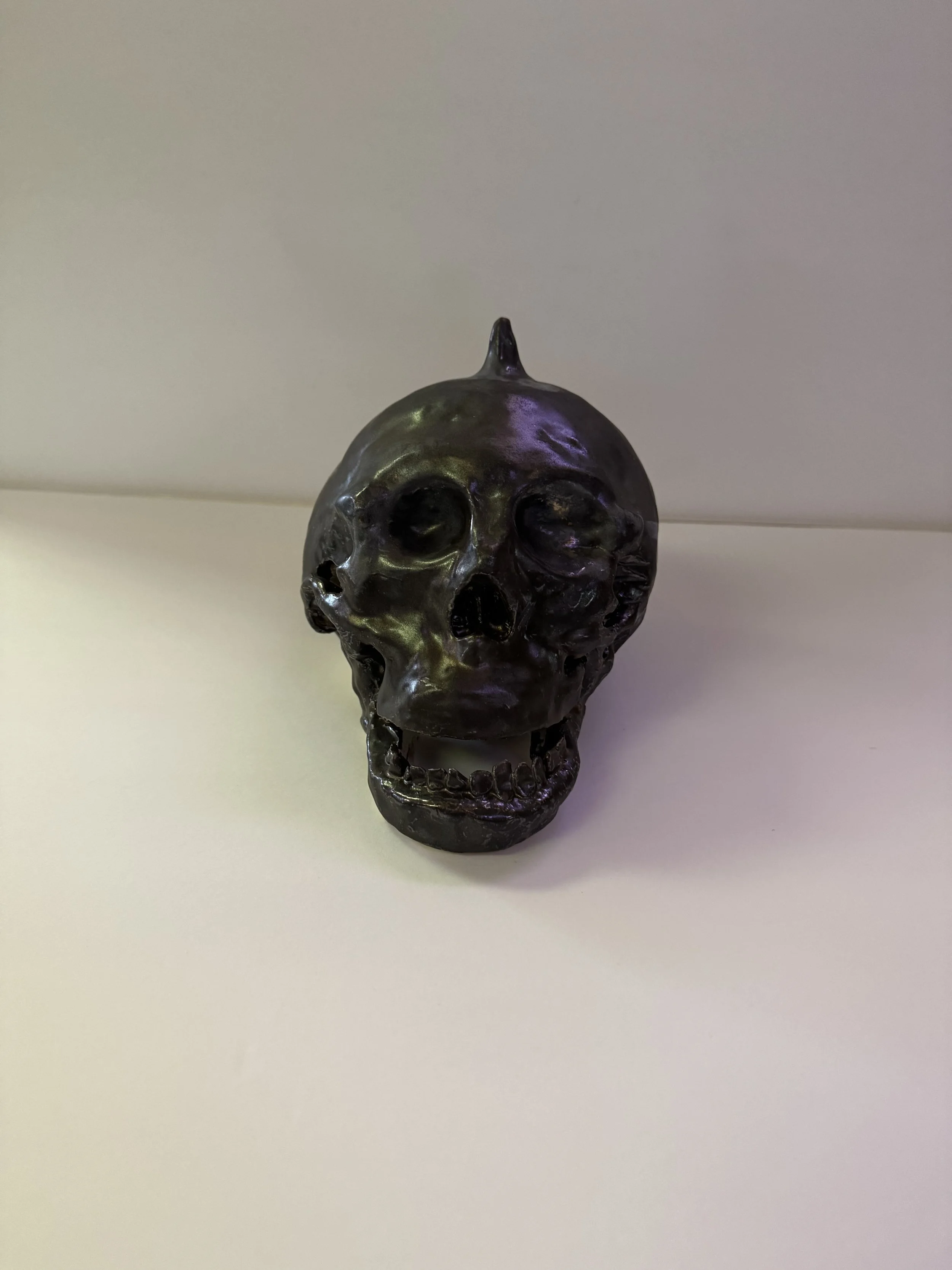 This sculpture shows a skull that I made. The horn represents how people can be affected or changed by things they go through. The dark surface reflects light and makes the viewer feel connected to it. I made this piece to show that damage doesn’t just mean an ending; it can also change what something becomes.