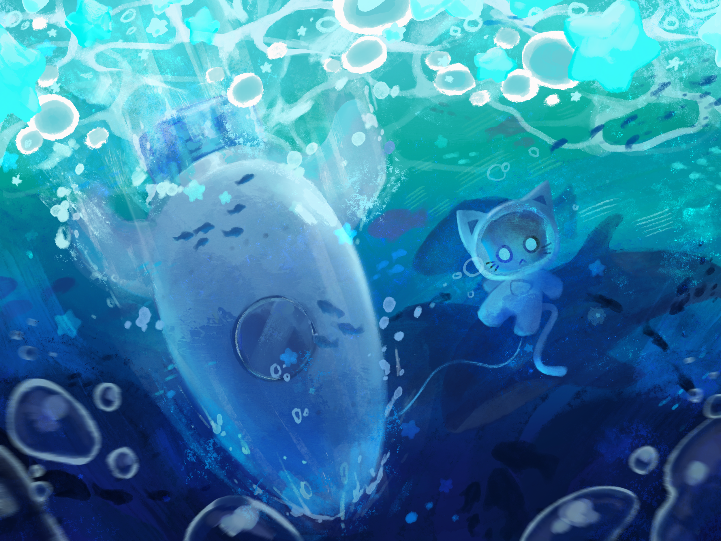What happens when a daring space explorer faces an unexpected mishap and plummets straight into the sea? We never expect to find any stars in the ocean, but when a situation makes the two worlds combine, you may be met with confusion and unexpected beauty. In my work, I attempted to depict the chaotic charm of experiencing something completely new and unordinary. I tried to use bright colors, different textures, and unique combinations to create a piece that would express the excitement and fear I feel when I find myself somewhere out of the norm.