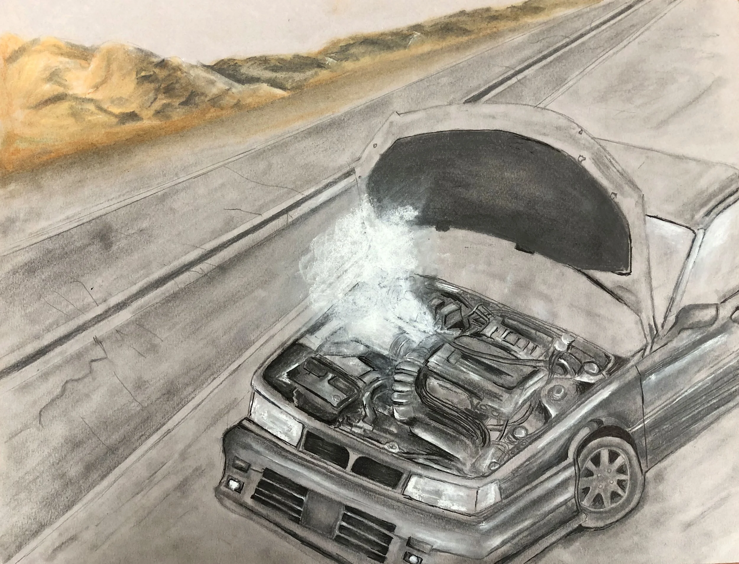 It depicts a broken down car on the side of a road in the middle of a desert. It shows the hopelessness and frustration that comes with events like these.