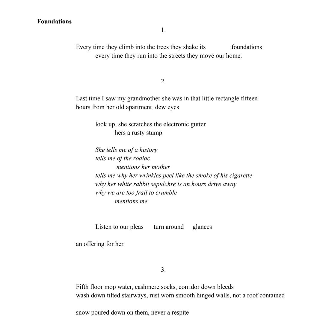 A duo of poems for my grandparents. With these two poems, I wanted to demonstrate how grief can layer itself into every part of our lives. It moves with us, it follows us. Instead of thinking of our loved ones in the past, we should think about how they would have lived now and what choices they would have made. They are now watching the world through our eyes and experiencing the world through our senses. I wanted to demonstrate with these poems how we can live with the grief of loss and become the hosts to experience the future for them.