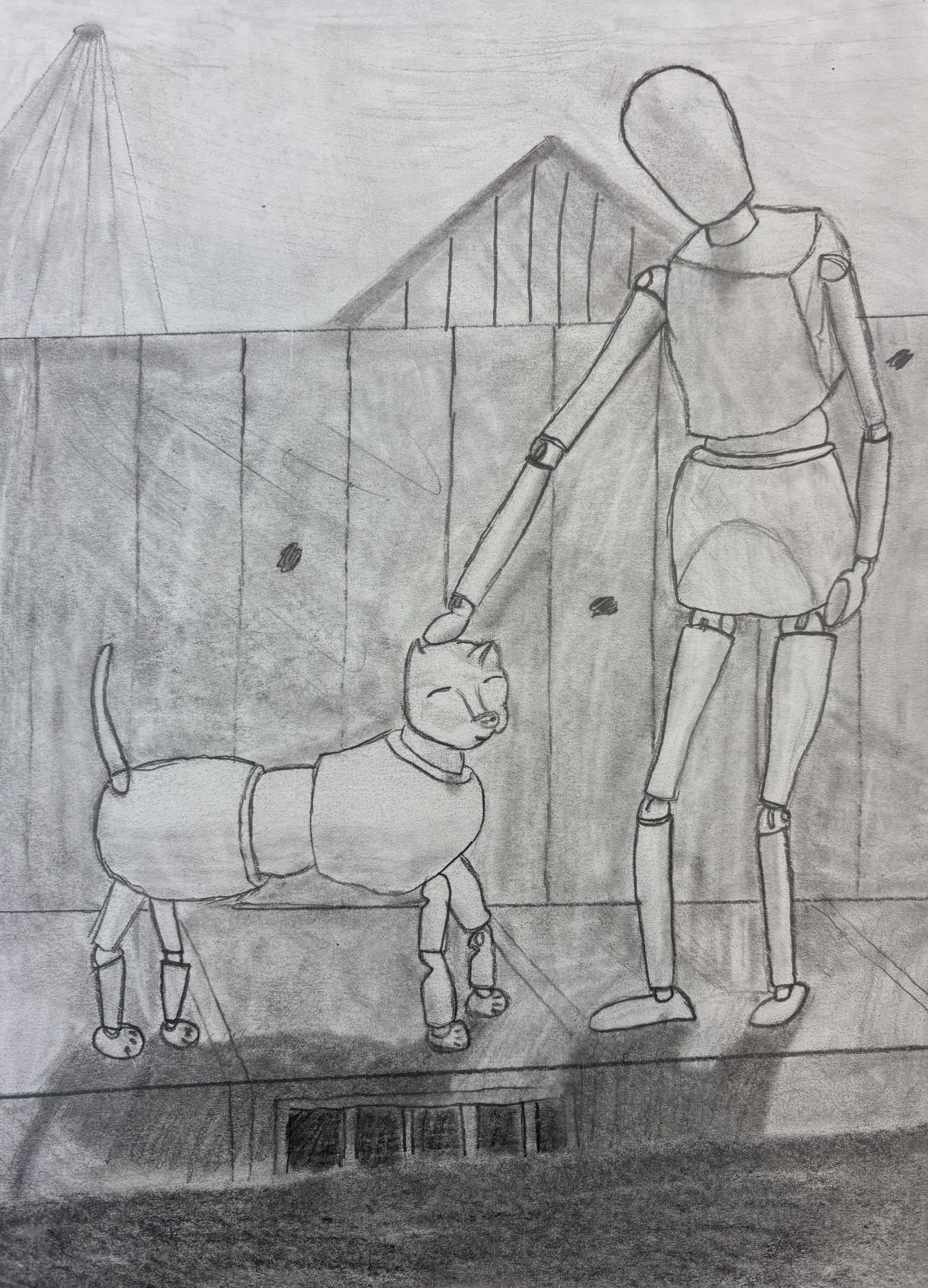 This artwork was based on my daily walks with my dogs and I wanted to encapsulate that feeling with this. I wanted to try drawing an art piece based on a still-life image I took, which consisted of a human mannequin and a cat/dog mannequin. This was my first artwork that I had to adjust for lighting and camera positioning to get the photo that I was looking for and allowed me to practice my technique in shading and proportions.