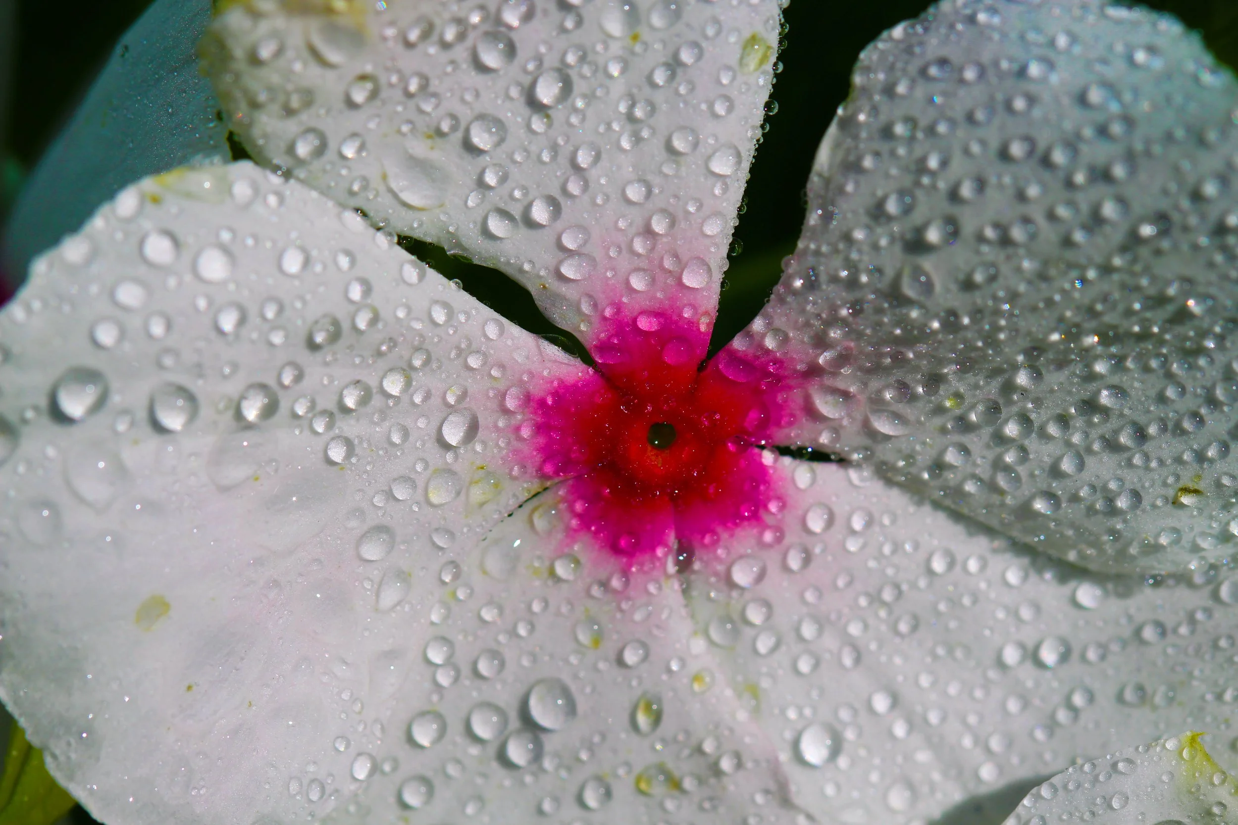 I captured a flower with a very bold colorful pink center with white and water drops surrounding it. This flower represents the Sun and the Stars with the Pink center being the sun and the water drops being the stars surrounding the sun.