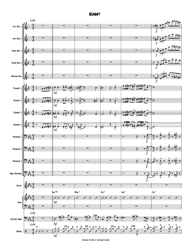 I had recently been obsessed with Jimmy Van Heusen's "It Could Happen to You" and dedicated my time to learning it on the Piano, Trumpet, and Saxophone. After countless experimentation with the changes, I had created a new melody following a different set of changes. I composed Sunny as a contrafact to Grant Green's solo on "Falling in Love with Love", using that for the A sections, and taking the last 8 bars in "It could Happen to you" for the bridge. I originally intended it to be a calm swing tune for a jazz combo, but I played around on the drums and decided a latin samba/mambo would work better overall. I wrote this in Sibelius and recorded my own drums on the piece, as I knew best what the drums should sound like in the piece. Plus it’d be too tedious to write out every single hit.