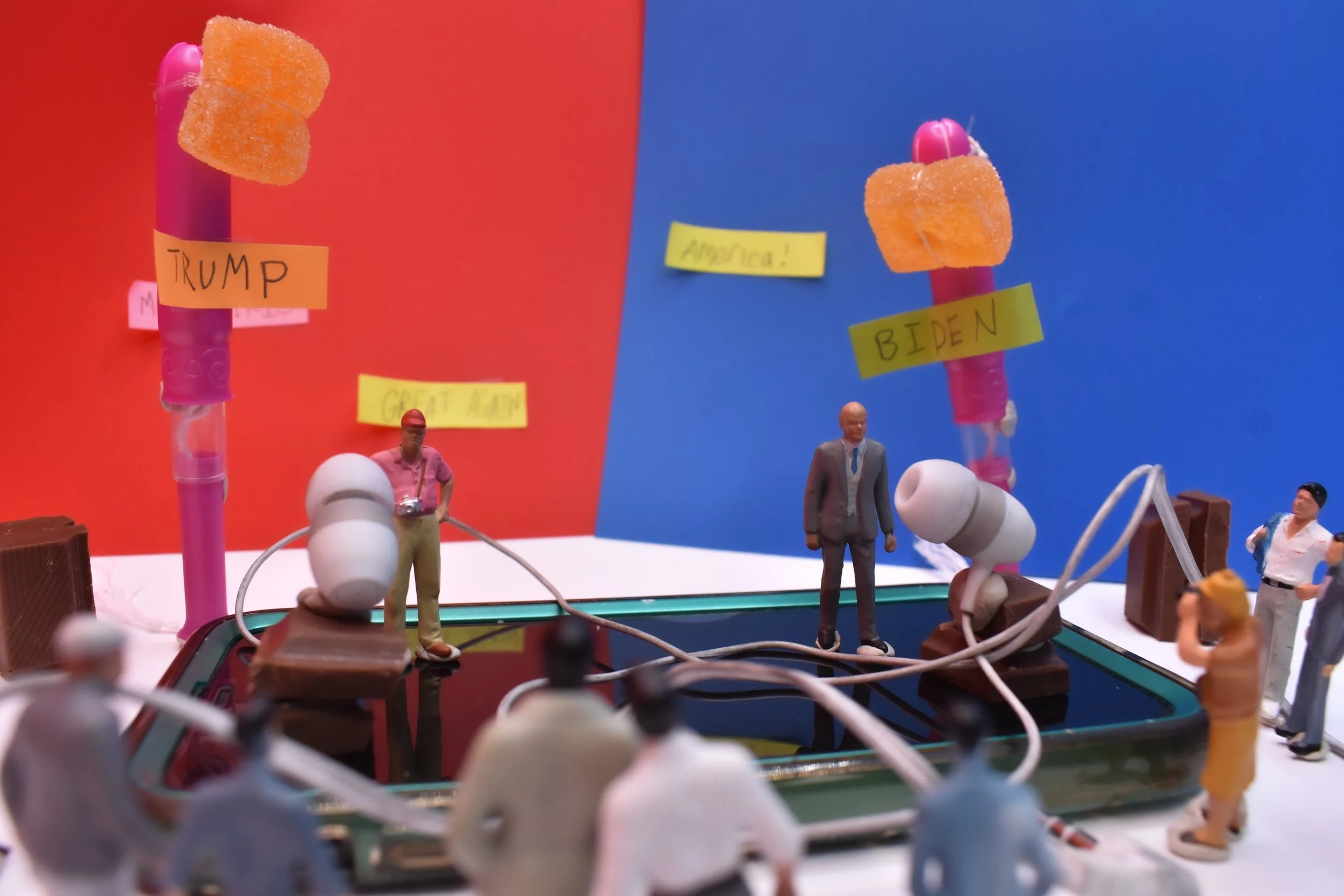Originally made for a photography class assignment, this photo turned into a social justice piece as I kept building the set. If you can't tell, the picture is a mini recreation of the presidential debates between Trump and Biden (labeled with their names in the photo.) The debate is held on a cellphone, representing how we are fed our media, and their microphones are my wired headphones, showing how quickly their words travel to us. The controversial bit was almost unintentional- I needed light posts to hold up my gummy lights and the candidate's nameplates. Looking through my bag, I found the perfect option: tampons! With all the abortion regulations and women's rights issues, I figured it would be an appropriate statement to the rest of the picture.