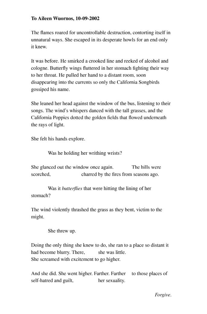Reality and falsehood can become so intertwined, especially after traumatic events. Aileen is a serial killer, her first kill being in self-defense. But as she continued, her reality was soon mixed with everything you don't want it to be mixed with. She became demonized. In my 2nd poem to Elizabeth, I humanize the demon, yet another distortion of reality. I've grown up with letters to our household from her murderer and rapist. So, in Elizabeth's poem, I explored those constant pestering what ifs that so many have.