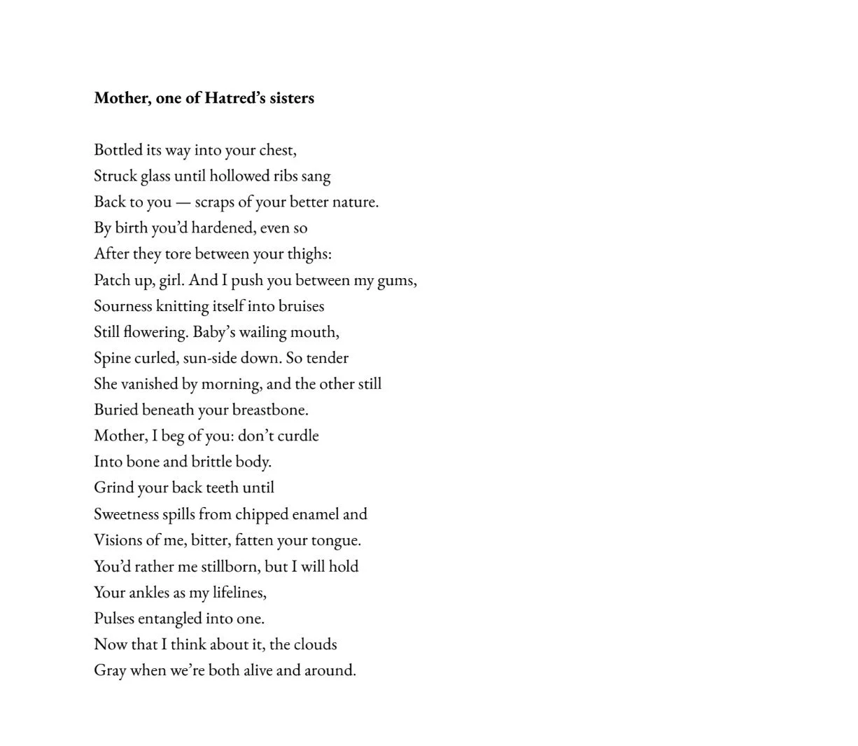 My work centers around topics of ephermerality, culture, and family, things that often change shape over time. I enjoy portraying the world through the inheritances we carry from those who raised us: their habits, their silences and wounds. Love and cruelty can live in the same gesture, and something broken, whether a person or item, can still buzz with life. I think a lot about my family’s stories: each poem feels like a conversation with whom and what came before me.