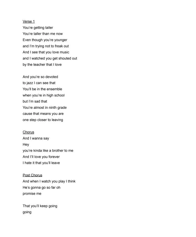 I wrote this song as a thank you to three people that I've known my whole life, who I'm just so grateful to be growing up with. They've looked out for me and lifted me up more times than I can count, especially in the last couple of years. I've felt that I needed to write this song for a while, and that feeling only grew as they kept being the amazing people that they are, and so kind to me. It's really hard for me to express how much I love and appreciate someone to their face, so I'm so happy I could do so with writing. It's the best feeling to put everything you've ever wanted to say to someone in a song, because you can pour your heart out freely, and create something so meaningful. I'm excited and terrified to finally give this thank you to them.