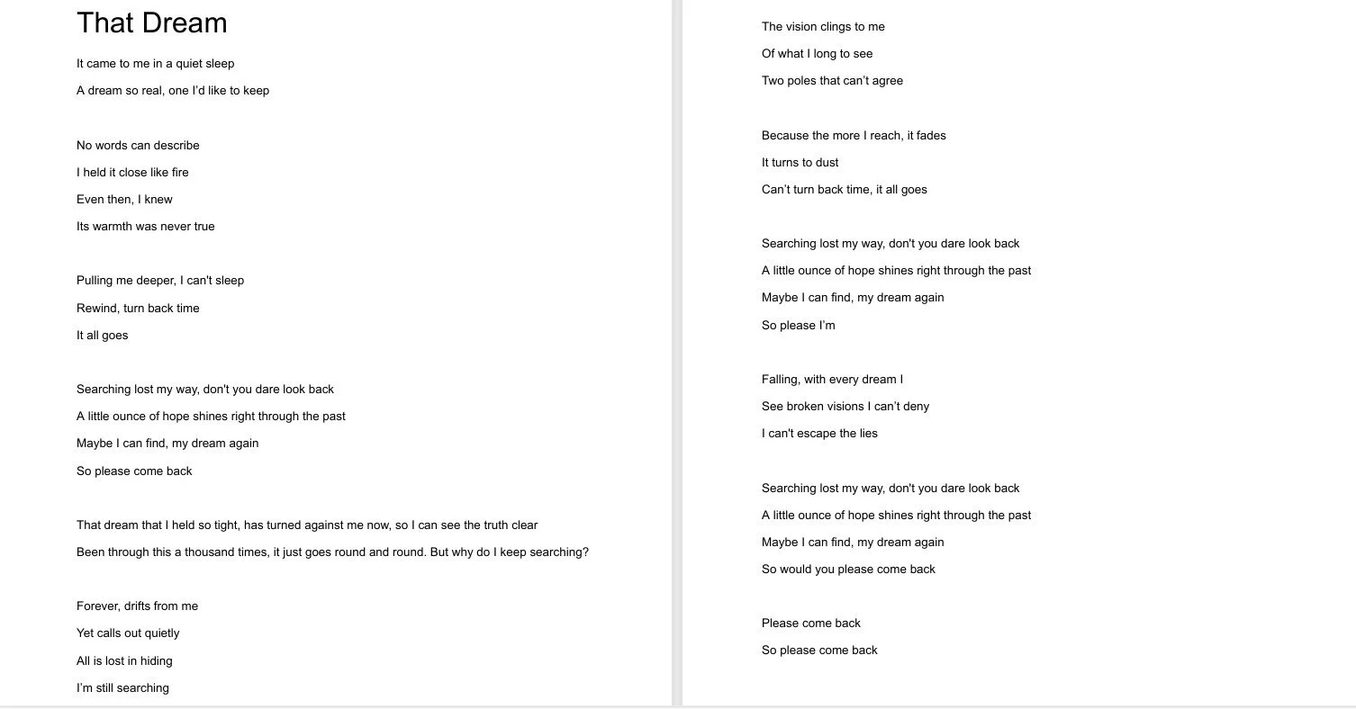 My song, "That Dream," captures the feeling of waking up and realizing you can’t remember what you just dreamt. The lyrics explore the regret of chasing that forgotten dream, as the search itself begins to drive you crazy.
