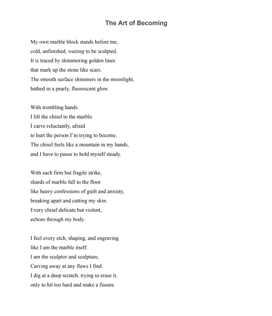 My poem reflects how I have learned to view myself differently. I once believed I had to be perfect and fall to other’s expectations, like smooth, unblemished marble. As a result, I began changing myself reluctantly to become more beautiful, which is represented by carving the marble sculpture. However, as time went on, I realized similarly to marble, my value lied in the patterns formed over time–not flawlessness. This poem is meant to demonstrate the message that I’m not a finished sculpture; I’m still being shaped, and I’m learning to appreciate the beauty of that.