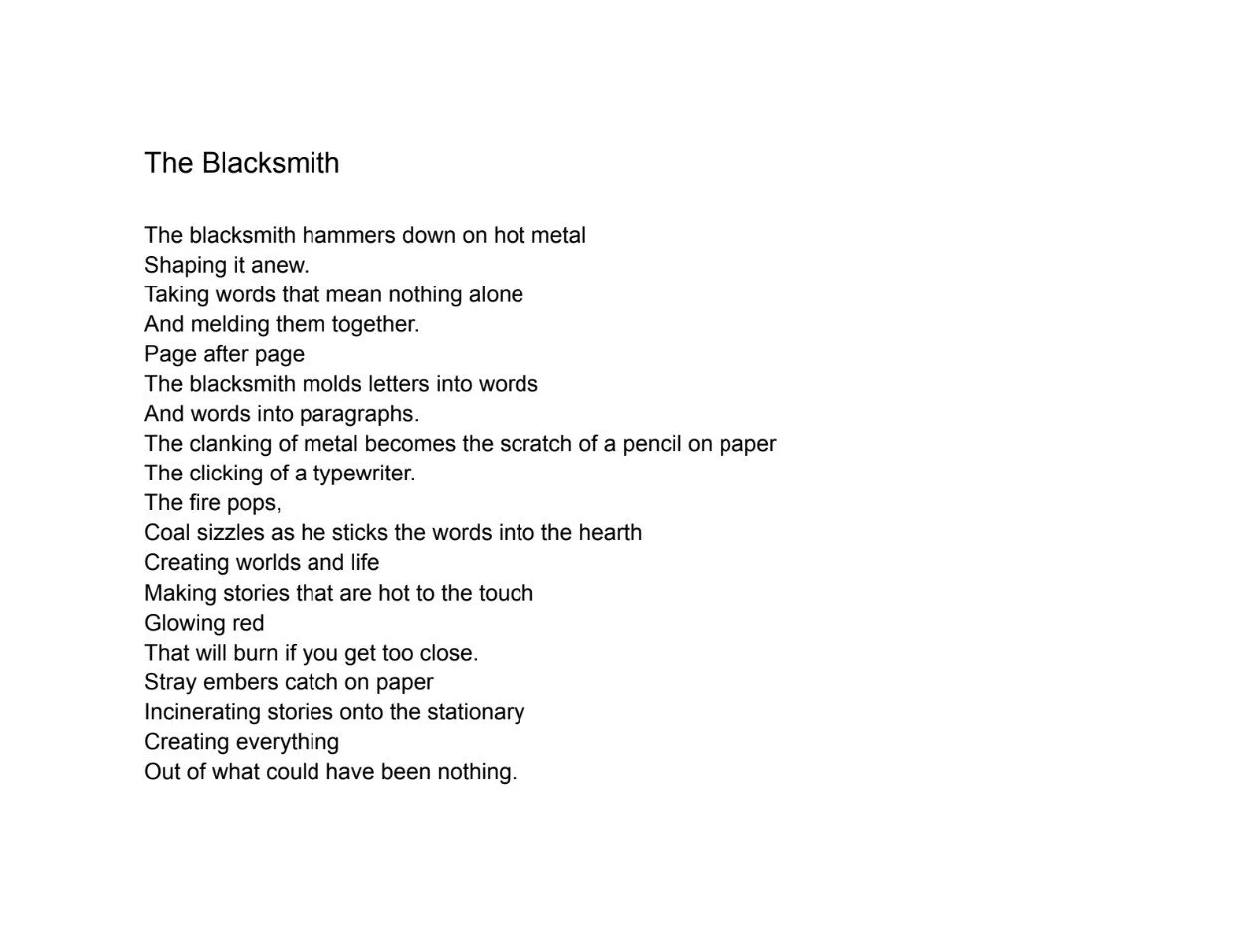 “The blacksmith” is about the dynamics between writers and their process of creating their pieces. I believe the shaping of metal, the creations made by blacksmiths, relate to the creativity of a writer and how they think up their stories and tales. It defines my writing process and what it feels like as I meld meaningless words into something bright and new.