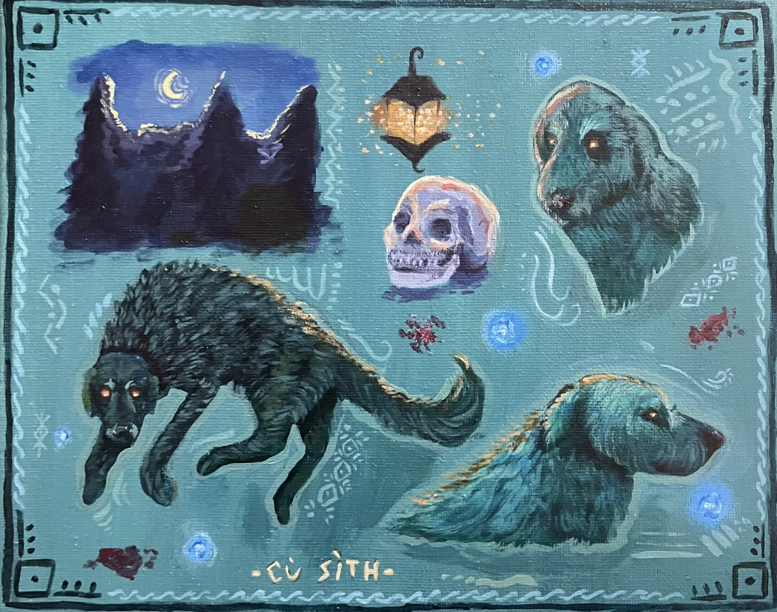 In Scottish folklore, the Cù Sìth (pronounced coo-shee and translating literally to "dog fairy") is a mythical hound, a servant of the fairies, and a harbinger of death. It is said to hunt in the Highlands of Scotland, ambushing travelers who have lost their way. The portfolio I am creating is based on this question: "How does mortality affect my perception of death?" and though it is quite a morbid topic, I believe I can show death and life in a harmonious and beautiful way. Through this prompt, I channeled the folklore and mythology of my family and Scotland into the piece and incorporated the stories I'd read to bring to life the twisted, chilling nature of the Cù Sìth. I am delighted to present the folklore of Scotland in such a visual way.