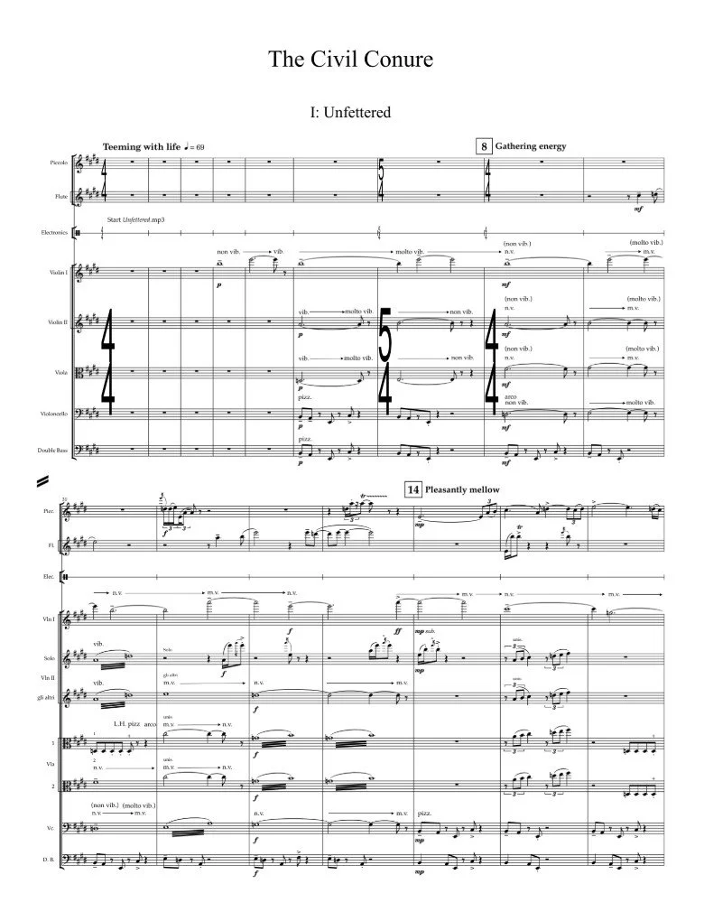 This is the first movement of my piece, The Civil Conure. Composed for String Orchestra, flutes, and electronics, the piece combines my own recordings of birds and traffic noises with acoustic instruments to tell a story about the human impact on the natural world, with a particular emphasis on birds. The piece was also inspired by the cherry-headed conures in San Francisco and their story of perseverance. The first movement, titled Unfettered, presents a peaceful yet vibrant soundscape as the music engages in call and response gestures with the bird recordings. Footsteps can also be heard in the background, laying the narrative groundwork for the rest of the piece.