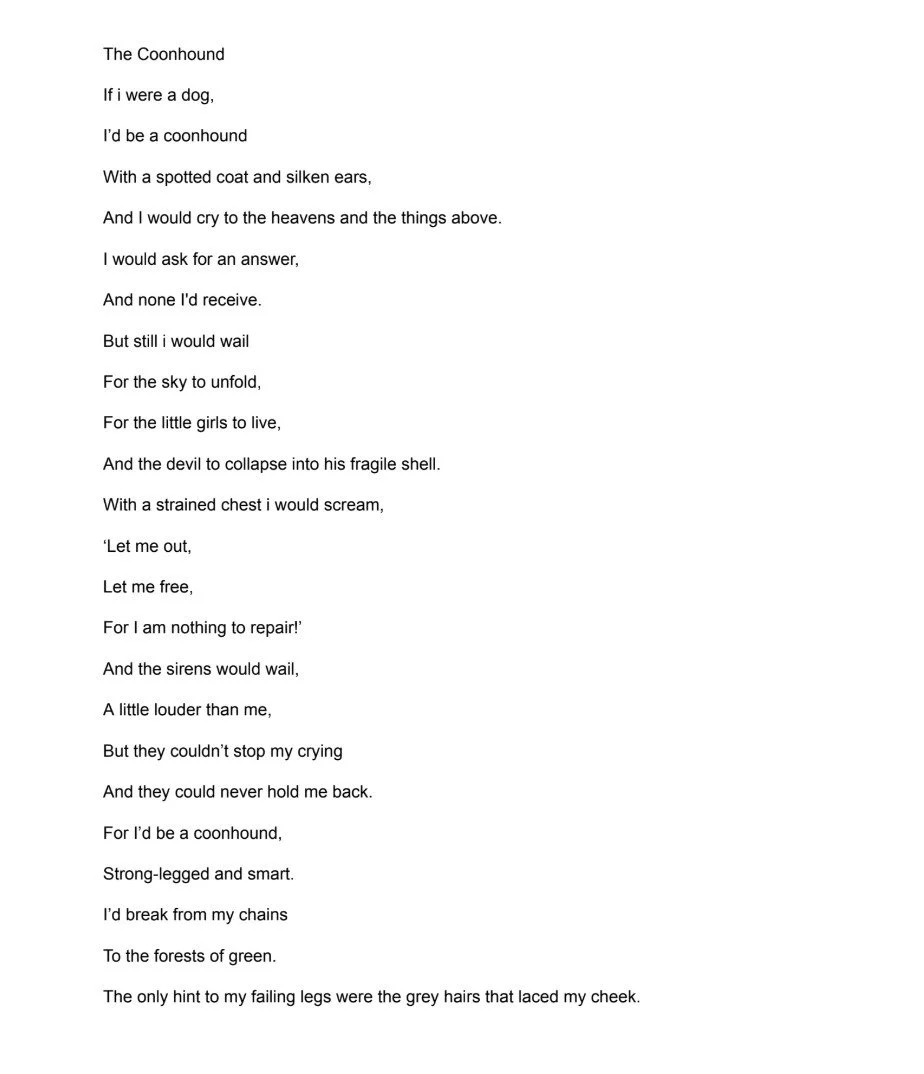 The Coonhound: This is a piece about a mother's strength and how she is memorialized in her absence. I wrote it with my ancestors in mind. Mangoes: Written during my time working the mango dessert stand at a farmer's market, when my hands were always sticky, this piece is meant to represent nostalgia and the bad side of sweet things. Children of Stars: This piece stemmed from my Chemistry class. Learning about our connection to stars made me feel so alone and so incredibly human.