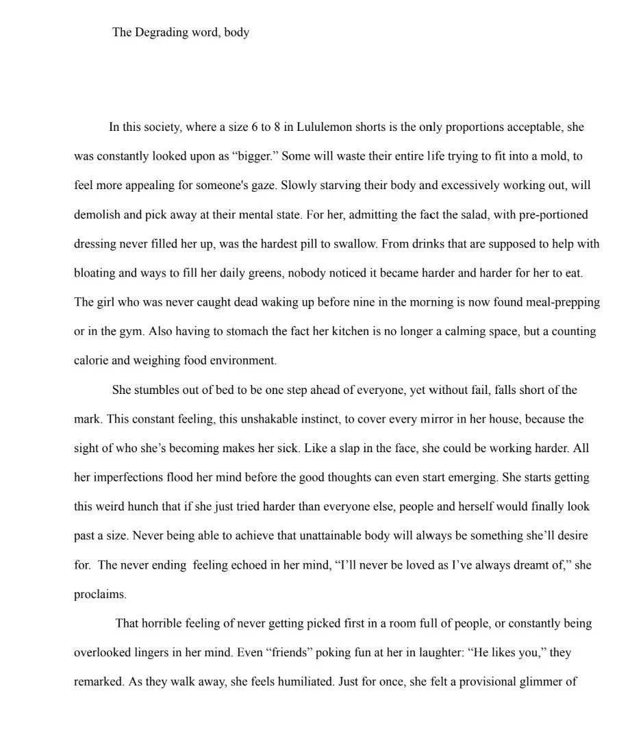 I made this writing piece to express how confined we are as people when looking at or how we feel about our bodies. By writing this piece, it helped me understand how hard I am on myself and wonder why I care about the number on the scale so much.