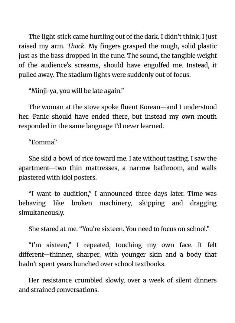 A girl at a K-pop concert is struck by a light stick and tumbles into another life-Minji's life-where she speaks perfect Korean, trains relentlessly, and rises as an idol while her real memories fade. Just as fame begins to feel permanent, the illusion shatters and she's snapped back to the concert, clutching the same light stick. When her phone buzzes with a message from Minji, she's left wondering which life was real-or if both still are.
