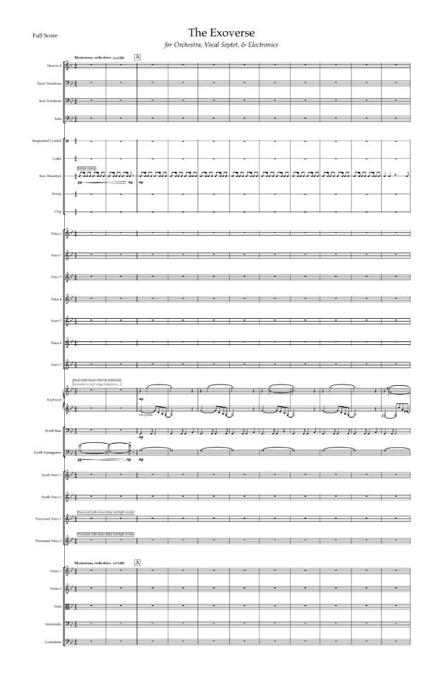"The Exoverse" is a piece written for vocal septet, orchestra, and electronics. While I was writing this piece, I was inspired by the idea of an intergalactic society–one that simultaneously revolved around humanity and technology. Because of this, I blended both acoustic and electronic sounds, creating a sonic space indicative of this unique society. The piece uses complex motivic writing, and the auditory texture is richly produced by blending MIDI orchestral instruments with electronic patches. I sang, recorded, and processed all vocal lines throughout the piece. Additionally, after writing the piece, I engineered the track; I recorded, edited, mixed, and mastered its various stems until I was satisfied with the auditory space.