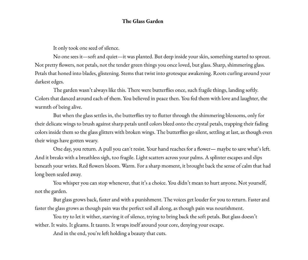 This piece began with the idea that some things inside us just don’t fade away just because we want them to. Glass won’t shatter. Not on its own. It stays sharp and patient, growing in spaces we don’t notice. I wanted to write about the type of pain that is masked in beauty, until you realize it cuts you every time you touch it. The glass garden is a place the narrator returns to, even if it harms them, because it’s the only place that feels familiar and understands them. Pain shapes us into what we become, sharpening us in a way softness could never. Yet there is always a choice. You can shatter the glass, but only if you truly want to end the cycle. This piece became a way to express the pain and beauty between holding on and finally letting go of the garden.