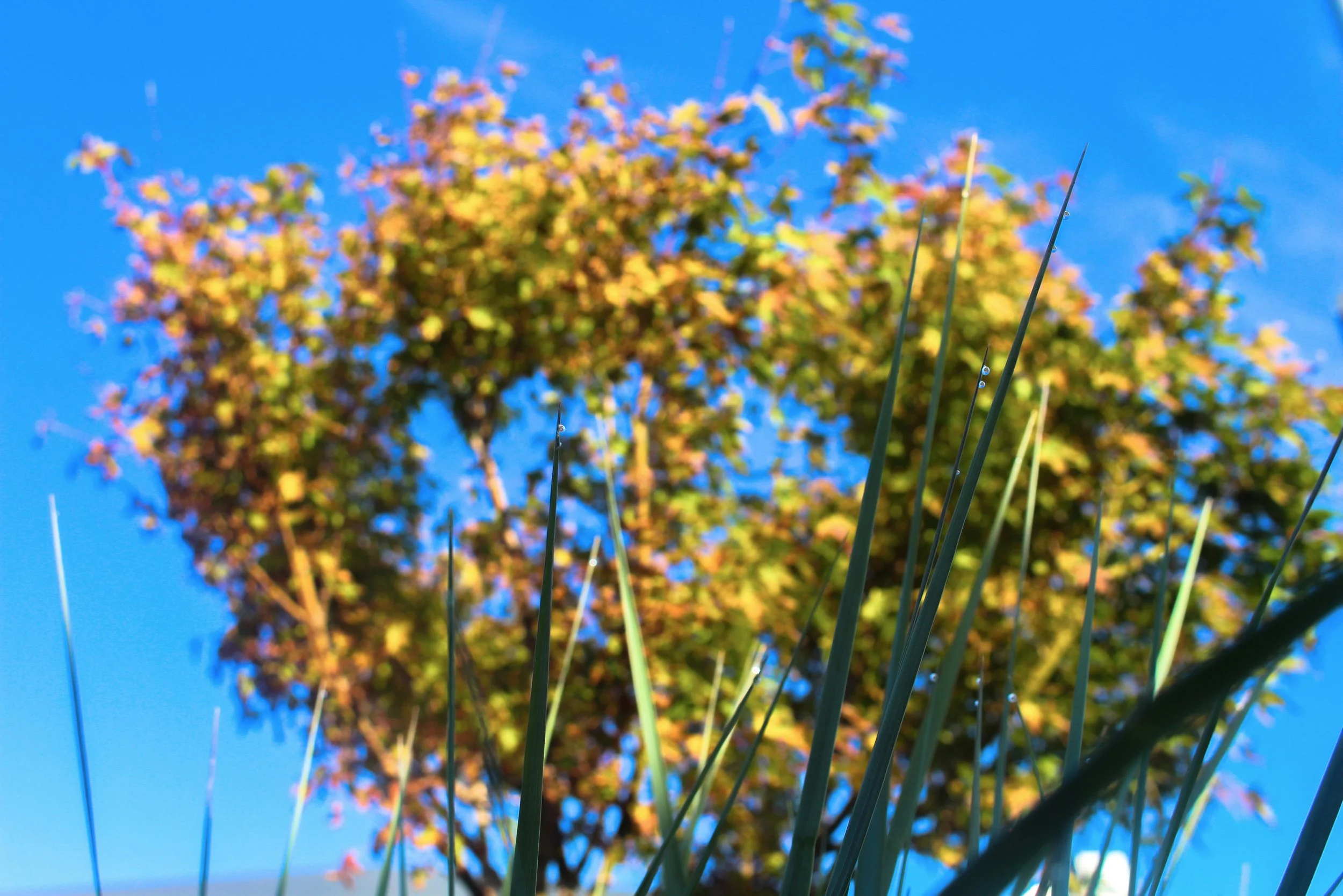 The photo includes some grass covered with dew in focus in the foreground and a tree out of focus in the back. It represents how if you only focus on the little more insignificant things in life you'll lose sight of the bigger picture, which can be beautiful.